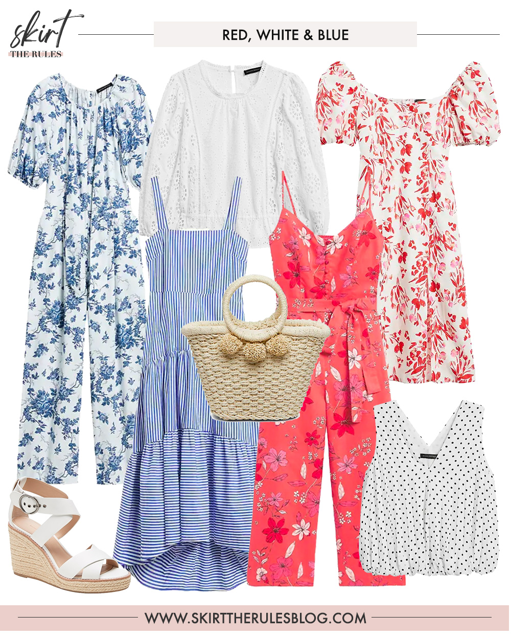 Up to 75% off everything at Banana Republic: Blue & White Floral Jumpsuit / White Eyelet Top / Blue & White Striped Dress / Coral Floral Jumpsuit / Red & White Floral Dress with Puff Sleeves / Straw Tote with Pom Poms / White Espadrille Wedges / Black & White Polka Dot Top