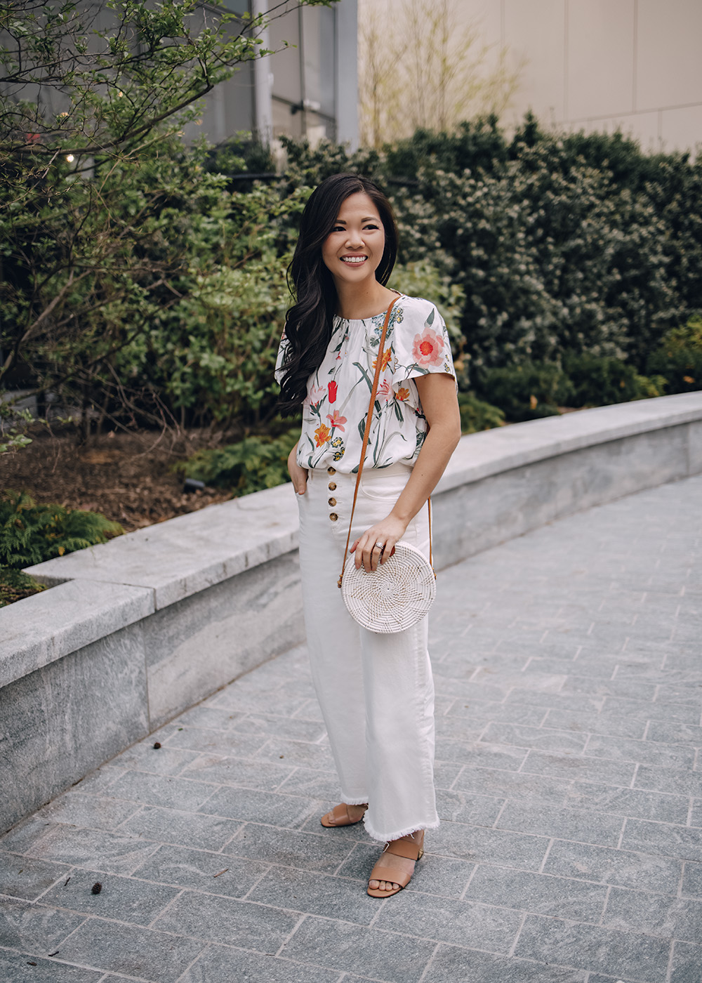 White Floral Blouse (XS) / White High Waisted Wide Leg Jeans (XSR) / White Straw Circle Bag / Tan Leather Mule Sandals / Charlotte Tilbury Matte Lipstick in ‘Pillow Talk’