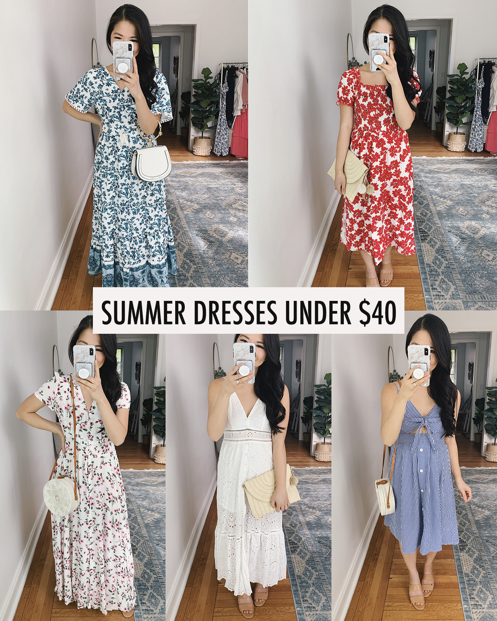 From top left: Blue & White Floral Dress ($30 – XS) / Red & White Floral Dress with Puff Sleeves ($27 – 4/6) / Pink & White Floral Maxi Dress ($35 – small) / White Eyelet Maxi Dress ($39 – 0/2) / Blue & White Gingham Tie Front Dress ($24 – small)