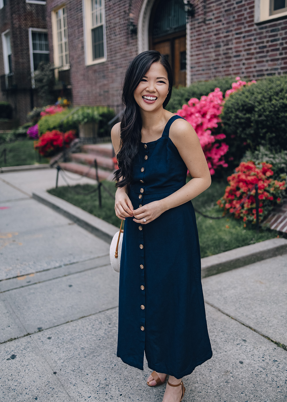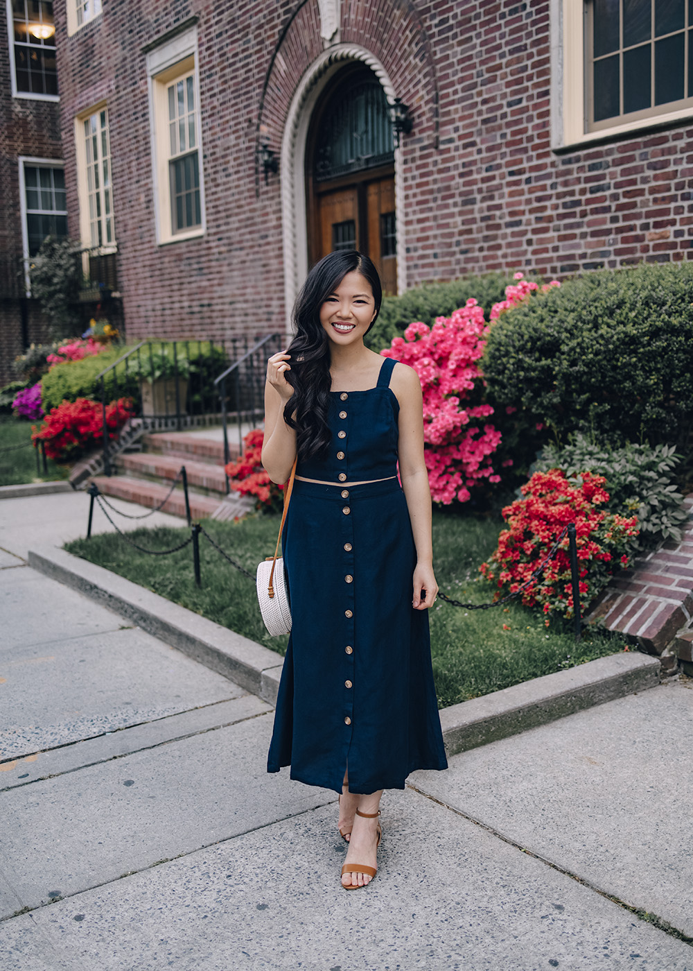 Matching sets aren’t anything new, but it seems to be a recent obsession of mine (which started with this gorgeous mint two-piece set). I love them because of how versatile they are (more proof here!). This navy set is no exception – it’s made of a thick linen material, which it perfect for summer. I love the tortoise buttons running down the entire front side of the top and skirt and the outfit is relatively modest (I hiked up the top for just a sliver of skin, but you can wear it without any midriff showing).