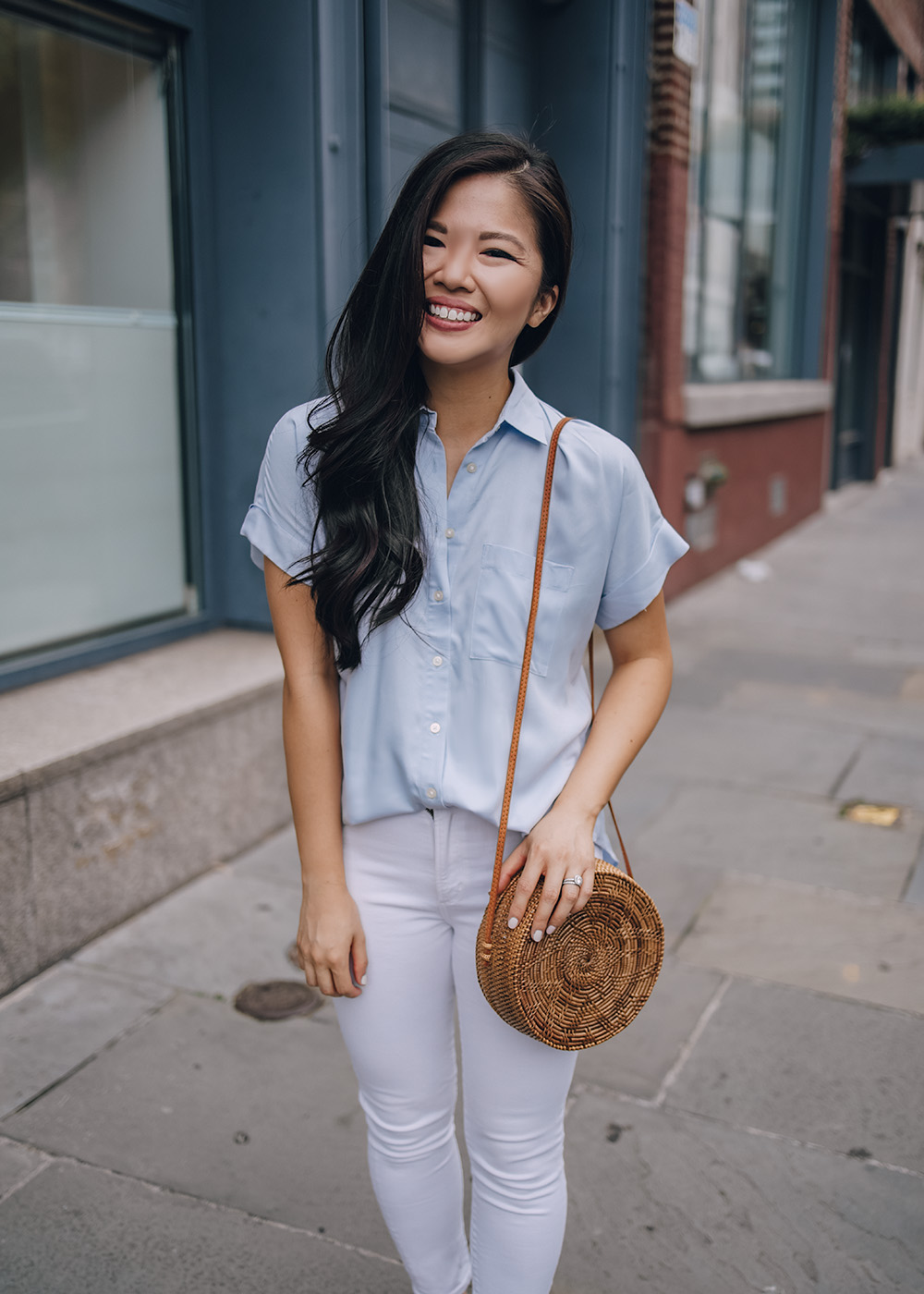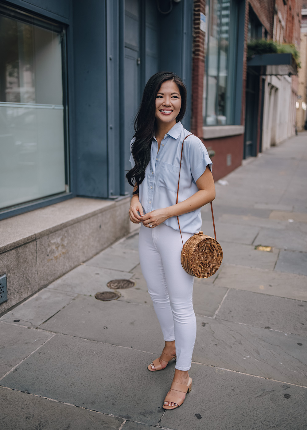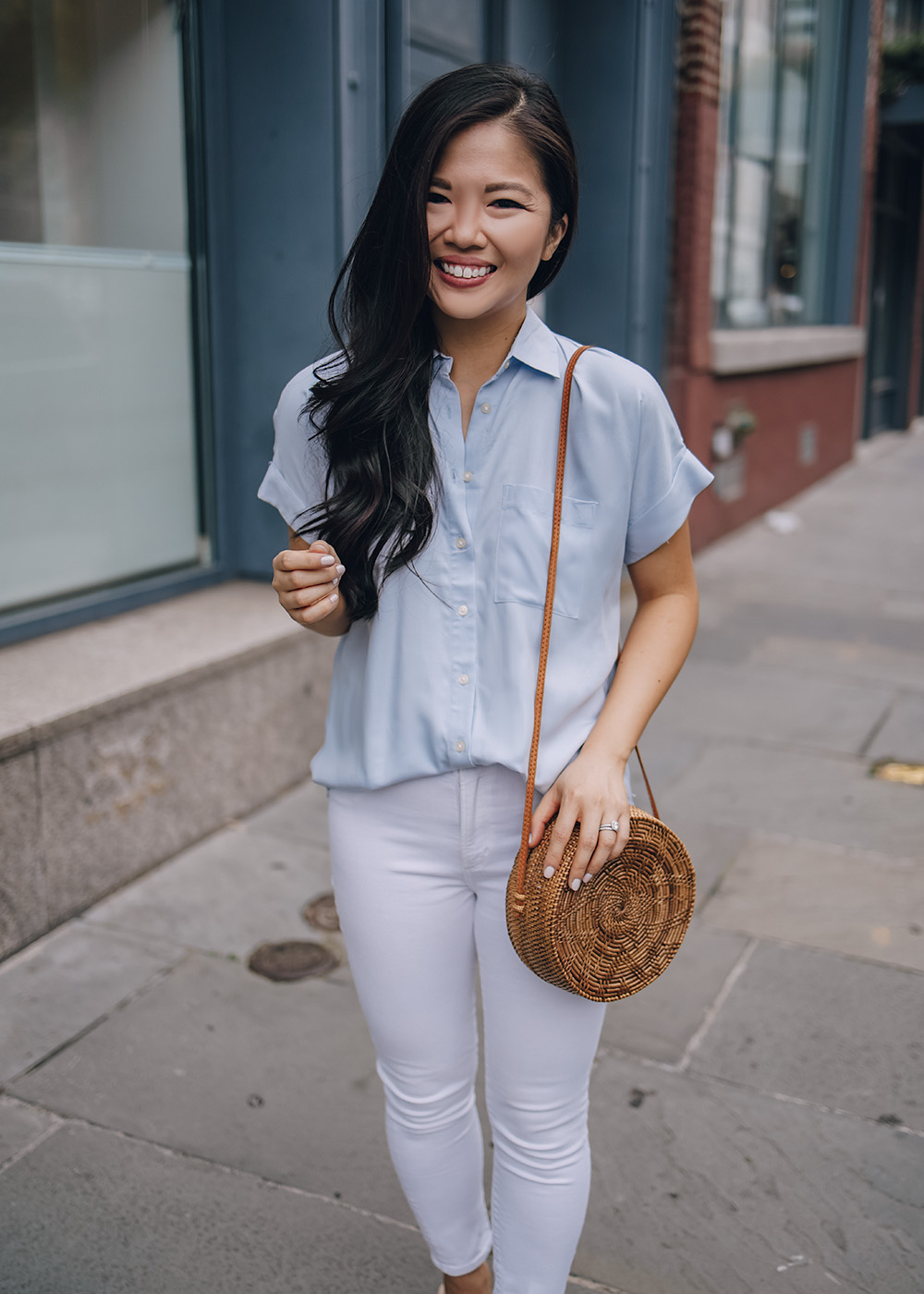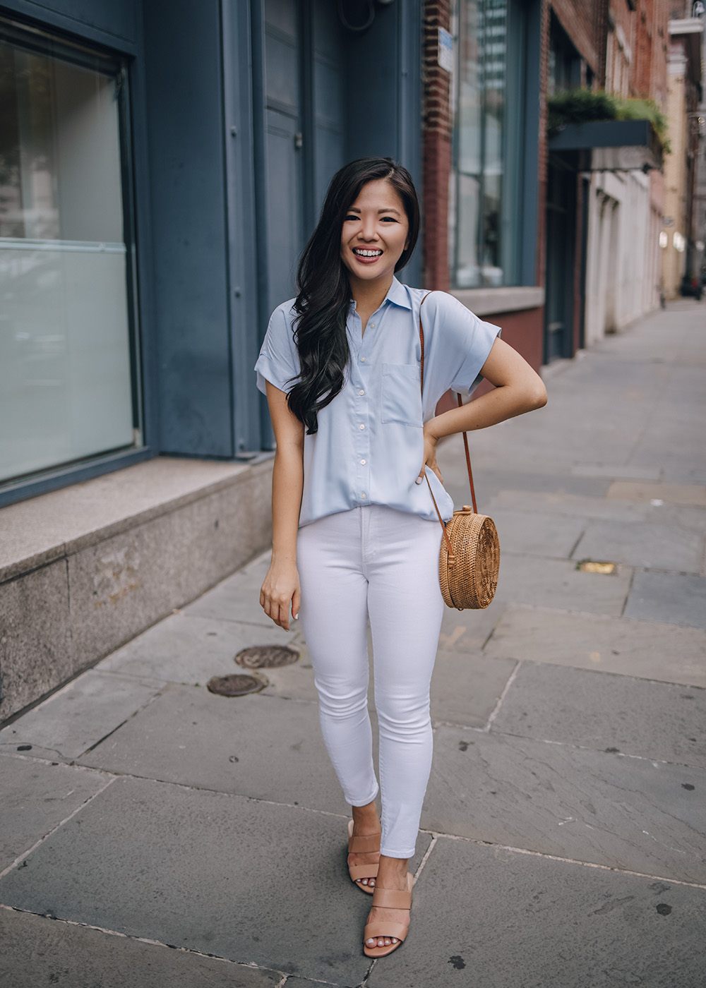 Light Blue Short Sleeve Shirt (XS – also comes in white and green) / Brown Straw Circle Bag / White High Waisted Skinny Jeans (26S) / Tan Leather Mules (6.5 TTS) / Charlotte Tilbury Matte Lipstick in ‘Pillow Talk’