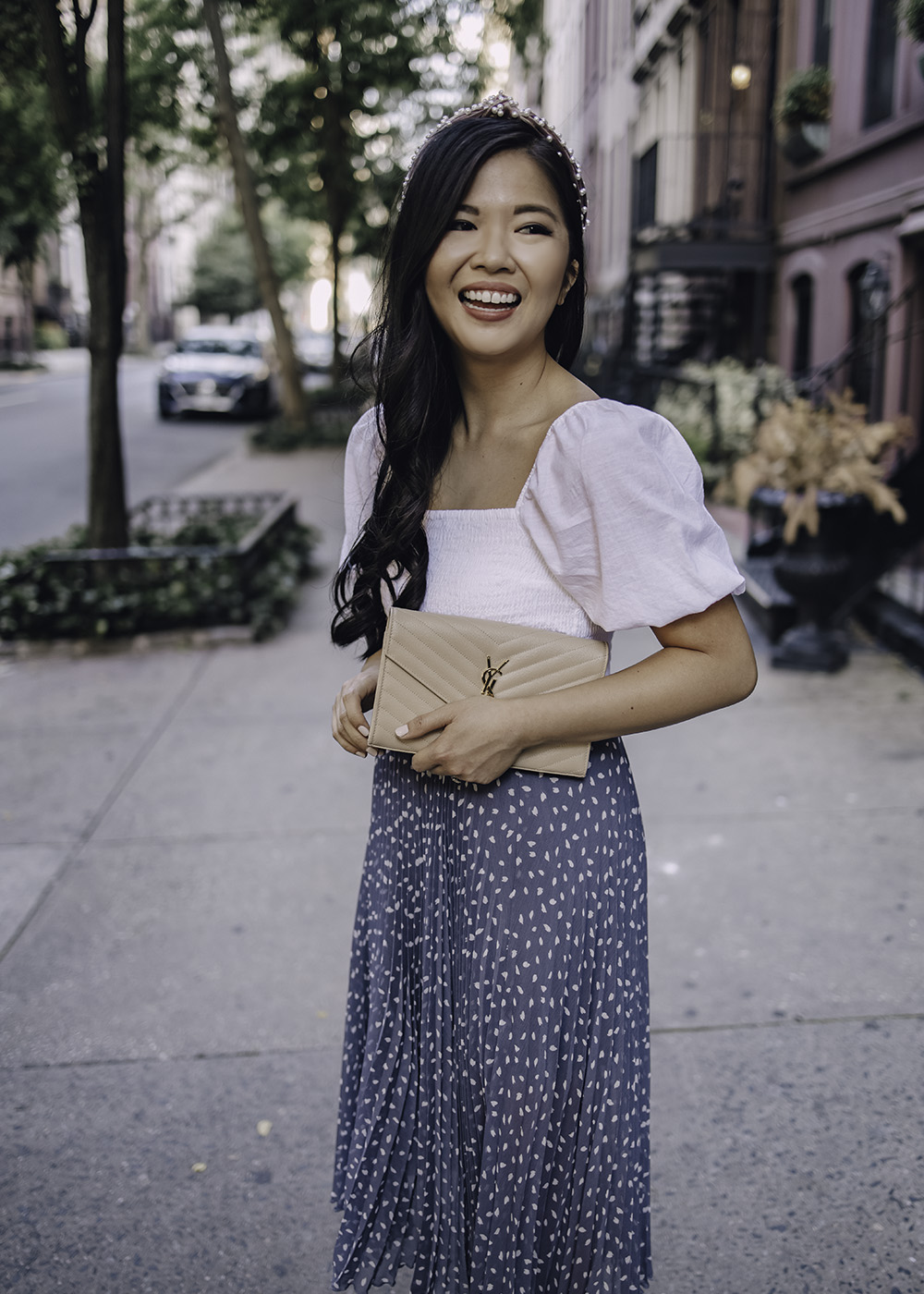 See original post: White Puff Sleeve Top (XS) / Blue & White Dot Pleated Midi Skirt (XS) / Pink Velvet Knotted Headband with Pearls / Saint Laurent Large Monogram Clutch