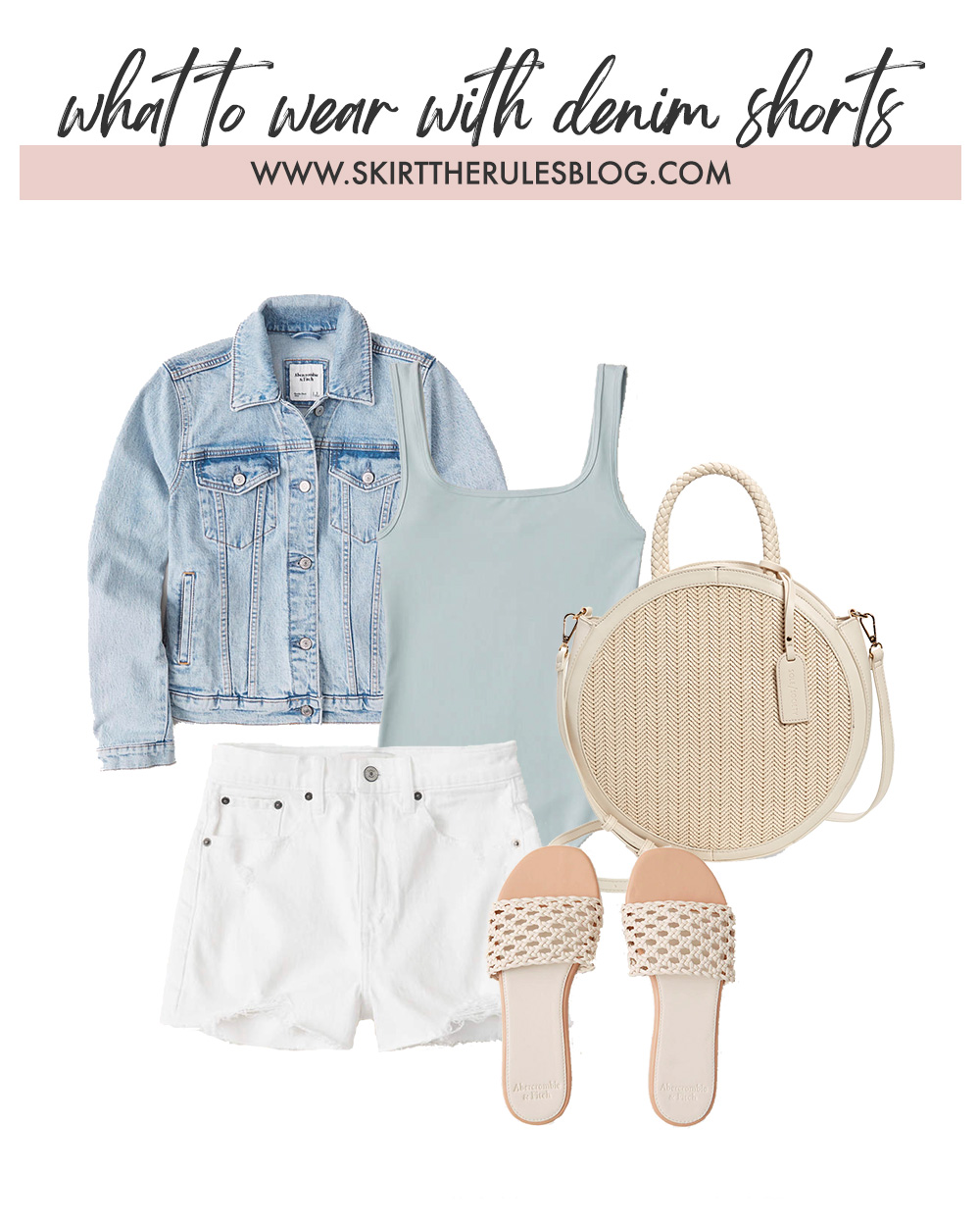 Light Wash Denim Jacket / Mint Bodysuit / Straw Circle Tote Bag / White High Waisted Jean Shorts / Cream Slide Sandals