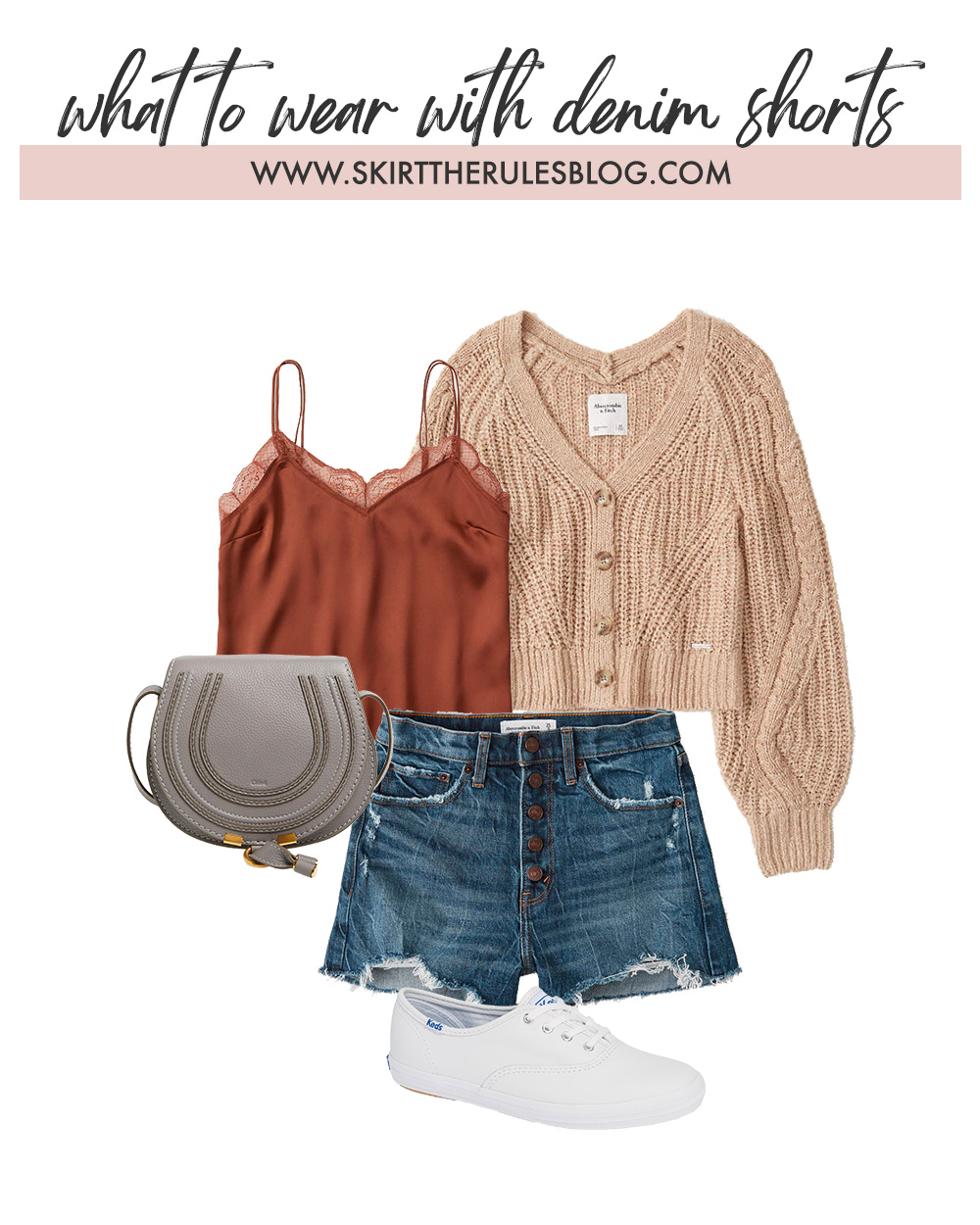 Camel Chunky Cardigan / Rust Lace Cami / Chloe Marcie Crossbody Bag / Dark Wash High Waisted Button Up Jean Shorts / White Leather Sneakers