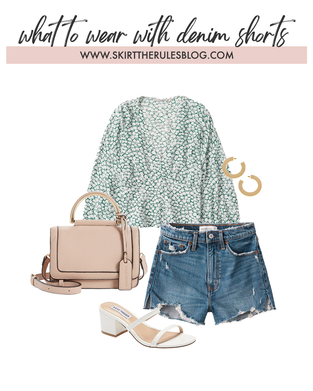 Light Green Floral Blouse / Straw Hoop Earrings / Pink Top Handle Bag / Medium Wash High Waisted Denim Shorts / White Mule Block Heel Sandals