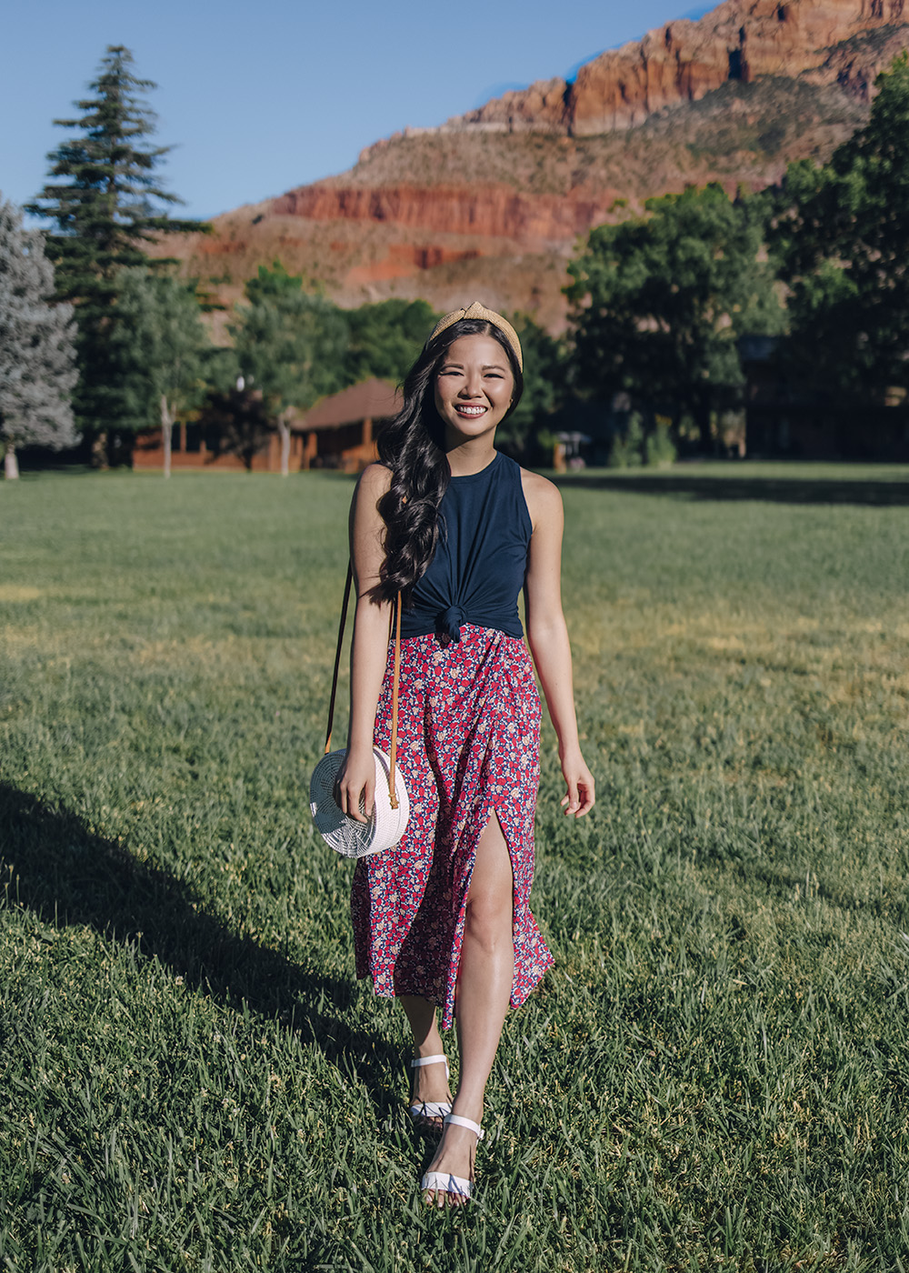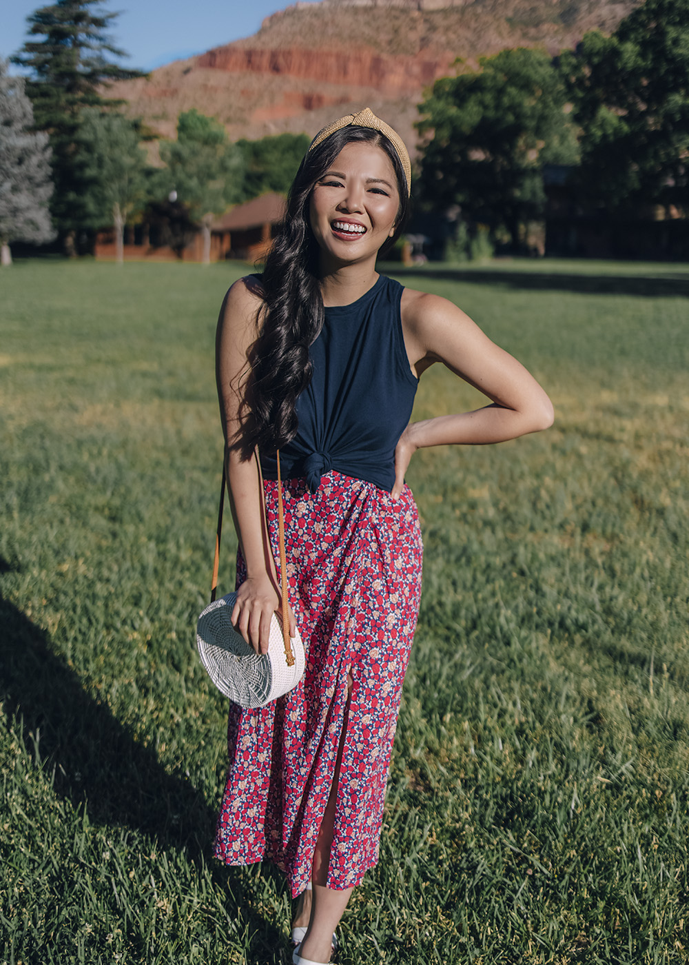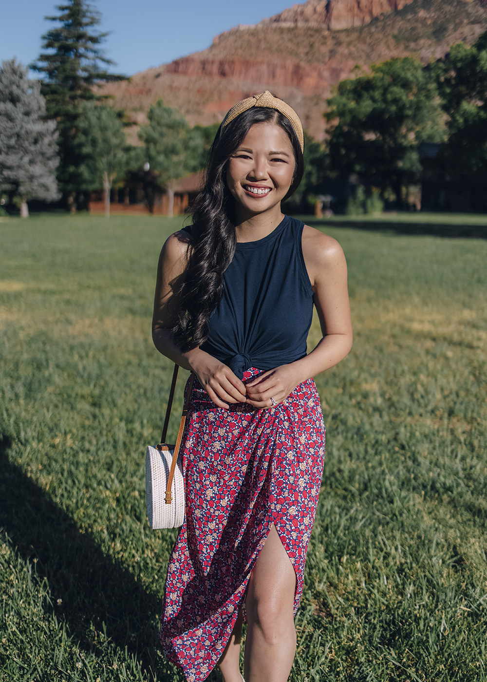 Navy Knotted Tank (similar) / Red Floral Midi Skirt (XS) / Straw Knotted Headband / White Straw Circle Bag / White Ankle Strap Sandals (6.5) / Charlotte Tilbury Matte Lipstick in ‘Pillow Talk’