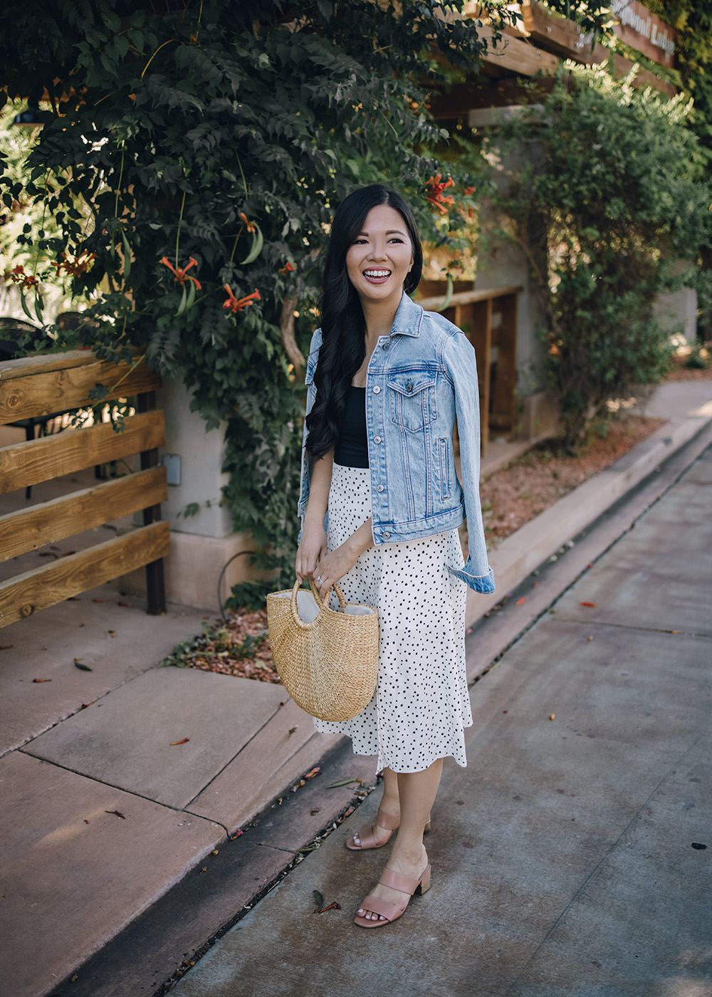 Seriously though – I’ve been on the hunt for the perfect light washed jean jacket and found it just in time for our big adventure out west. Hopefully you haven’t gotten tired of seeing it yet – it’s my favorite thing to complete an outfit with (although getting harder to do in the summer heat!). I love paired with this spotted midi skirt – the perfect balance of casual and feminine.