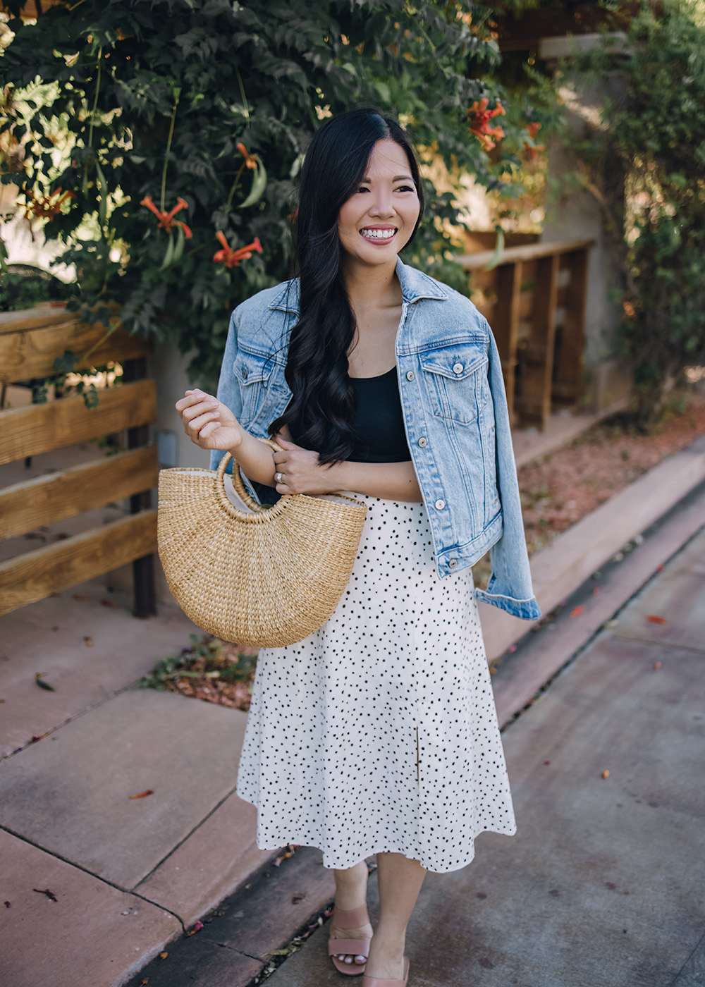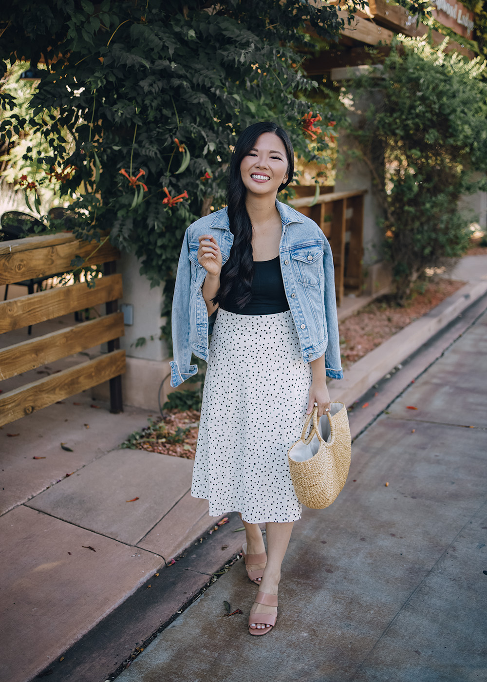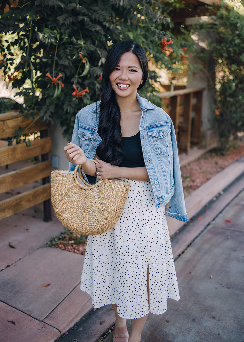 Light Blue Denim Jacket (XS) / Black Tank Top (XS – on sale for $6) / Dotted Midi Skirt (0 – on sale for $30) / Straw Tote Bag / Tan Leather Mules / Charlotte Tilbury Matte Lipstick in ‘Pillow Talk’