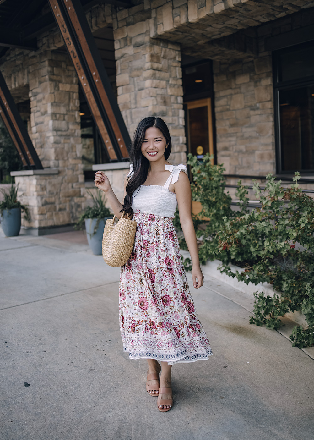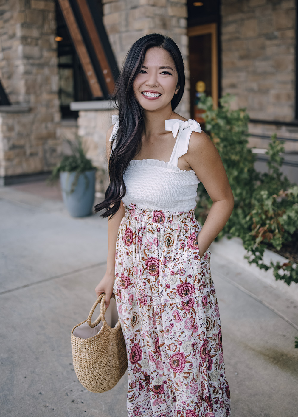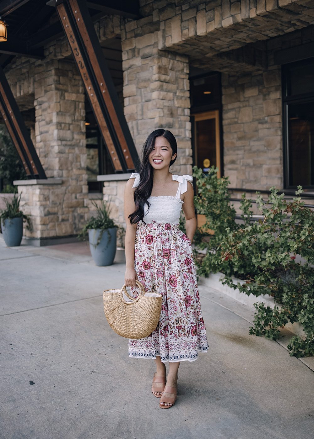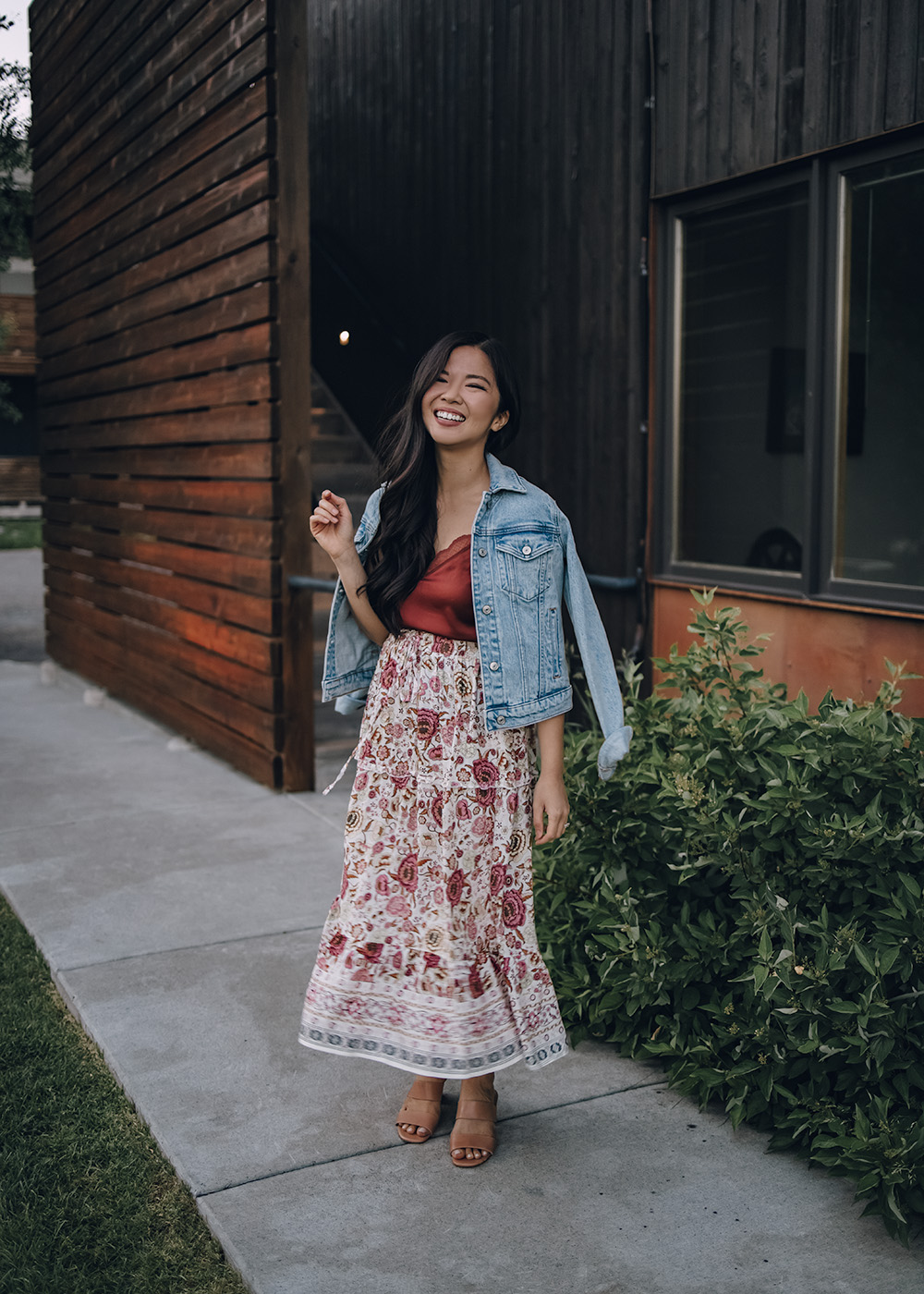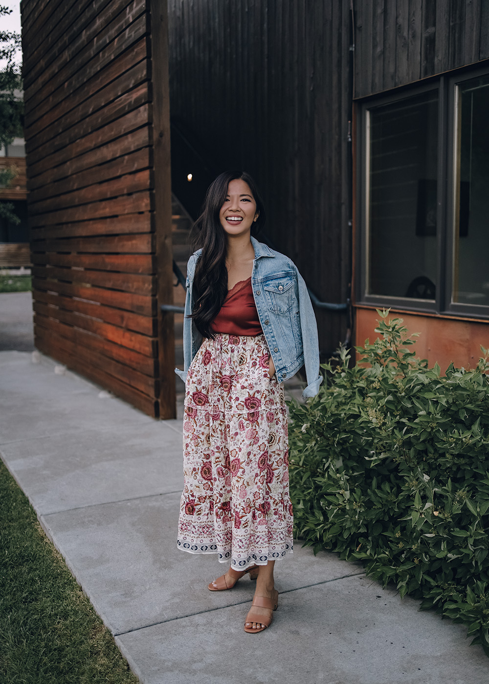 Left: White Smocked Top with Tie Straps (S – only $13!) / Floral Midi Skirt (S – $28) / Straw Tote Bag ($34) / Tan Leather Mules (6.5) / Right: Light Blue Denim Jacket (XS) / Rust Satin Lace Cami (XS – on sale for $25) / Floral Midi Skirt (S – $28) / Tan Leather Mules (6.5)