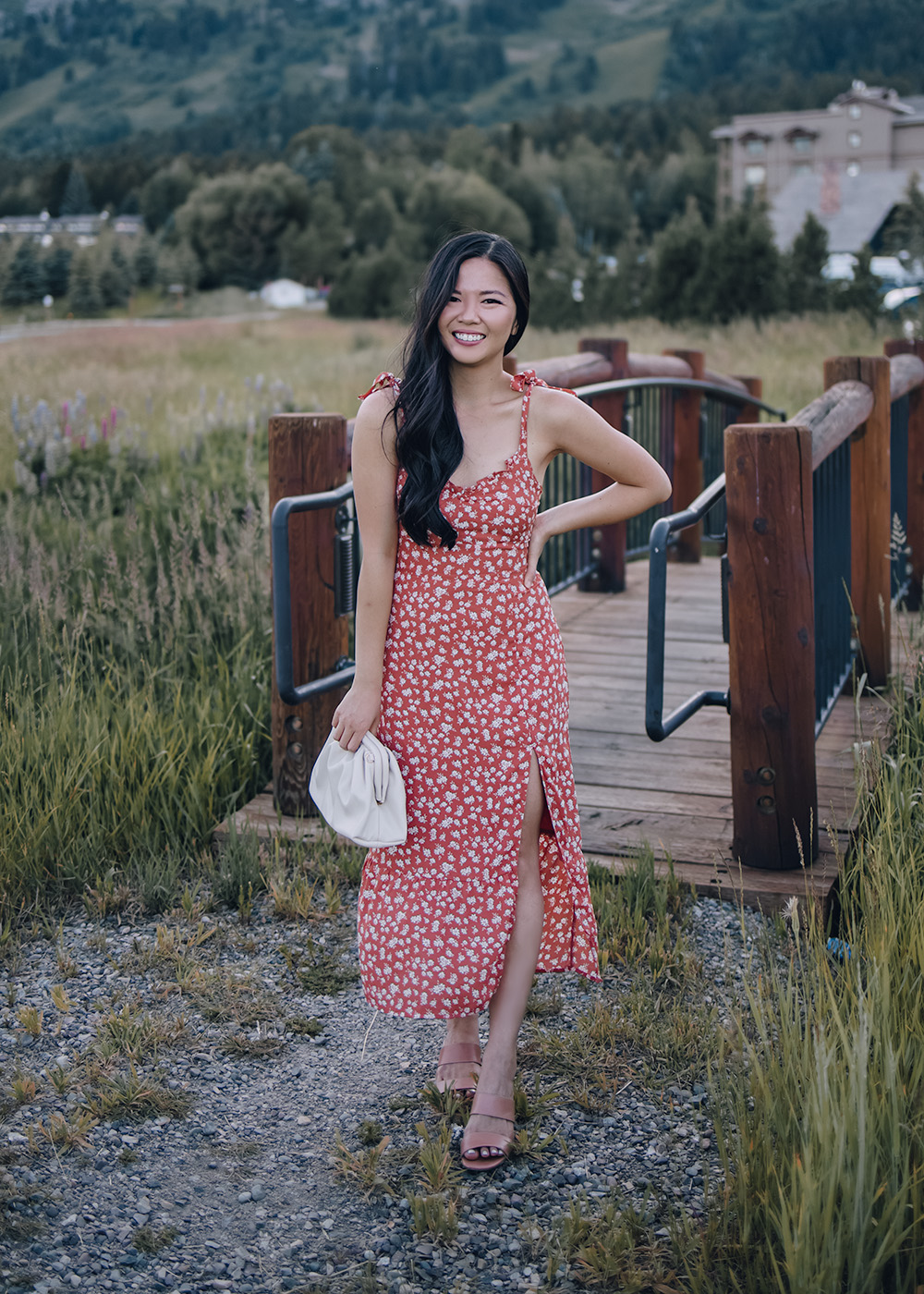 Orange Floral Midi Dress with Leg Slit / Cream Slouchy Clutch / Tan Leather Mules / Charlotte Tilbury Matte Lipstick in Pillow Talk