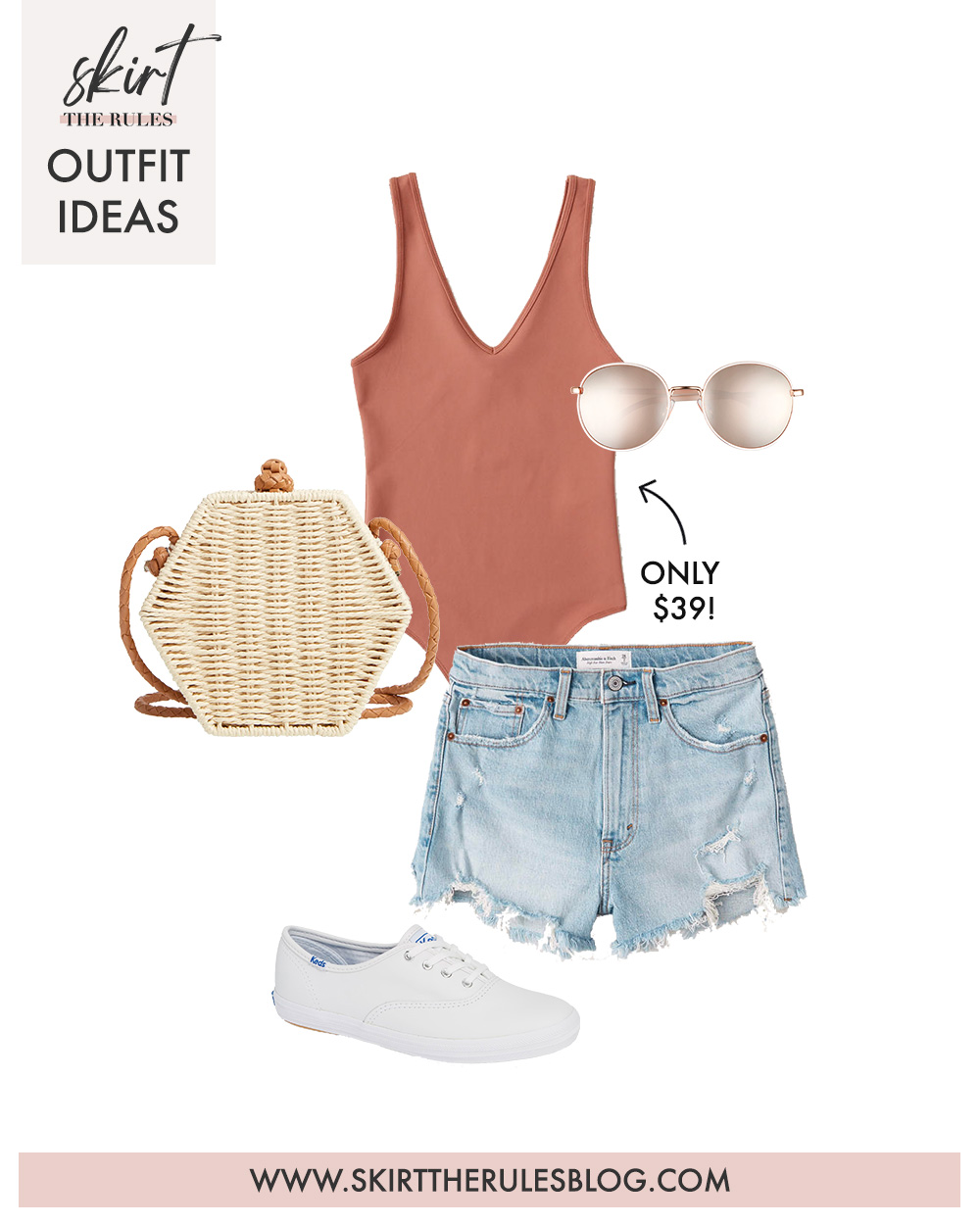 Terra Cotta Bodysuit / Round Mirrored Sunglasses / Straw Crossbody Bag / Light Wash High Waisted Denim Shorts / White Sneakers