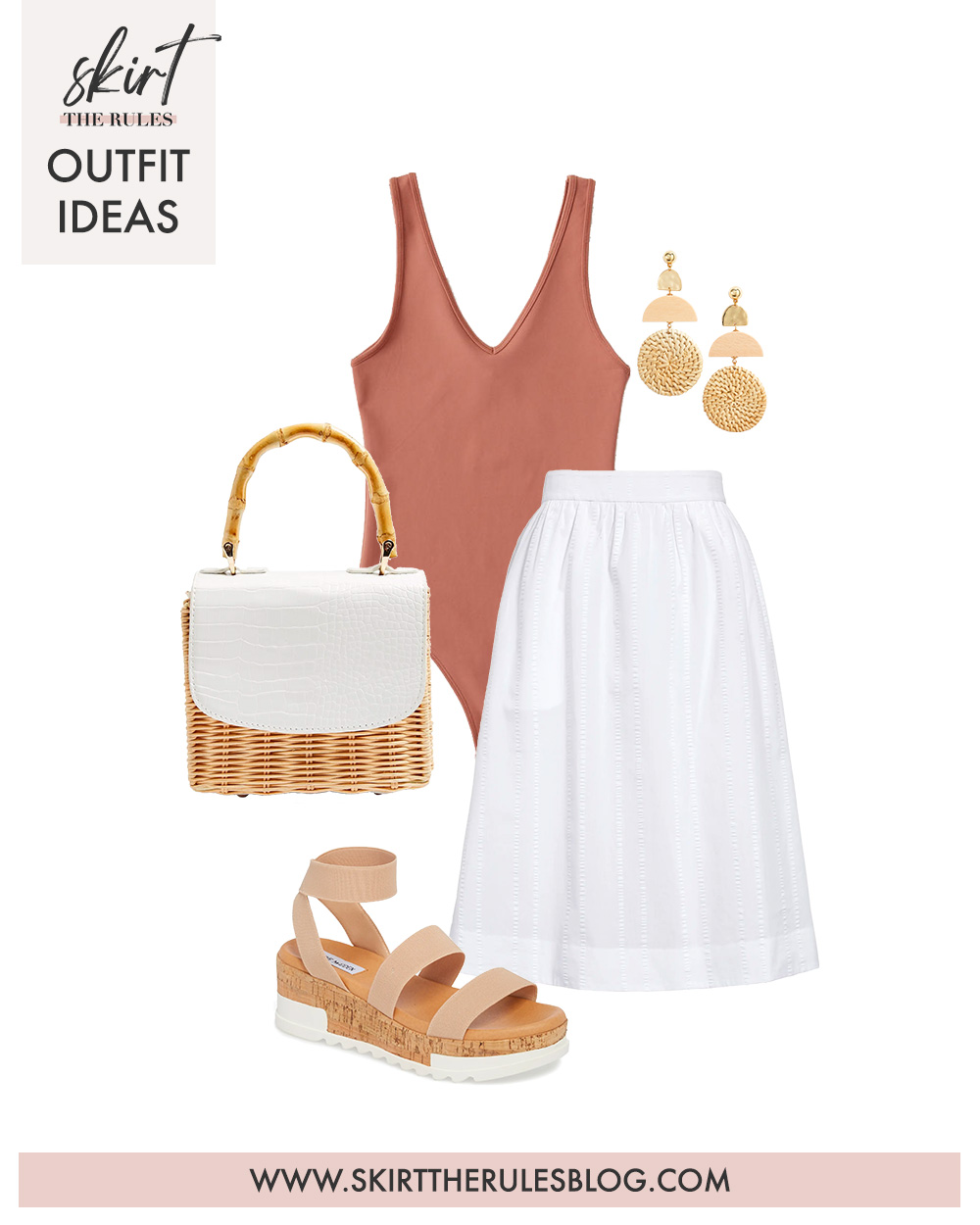 Terra Cotta Bodysuit / Straw Statement Earrings / Rattan Purse / White Midi Skirt / Nude Flatform Sandals