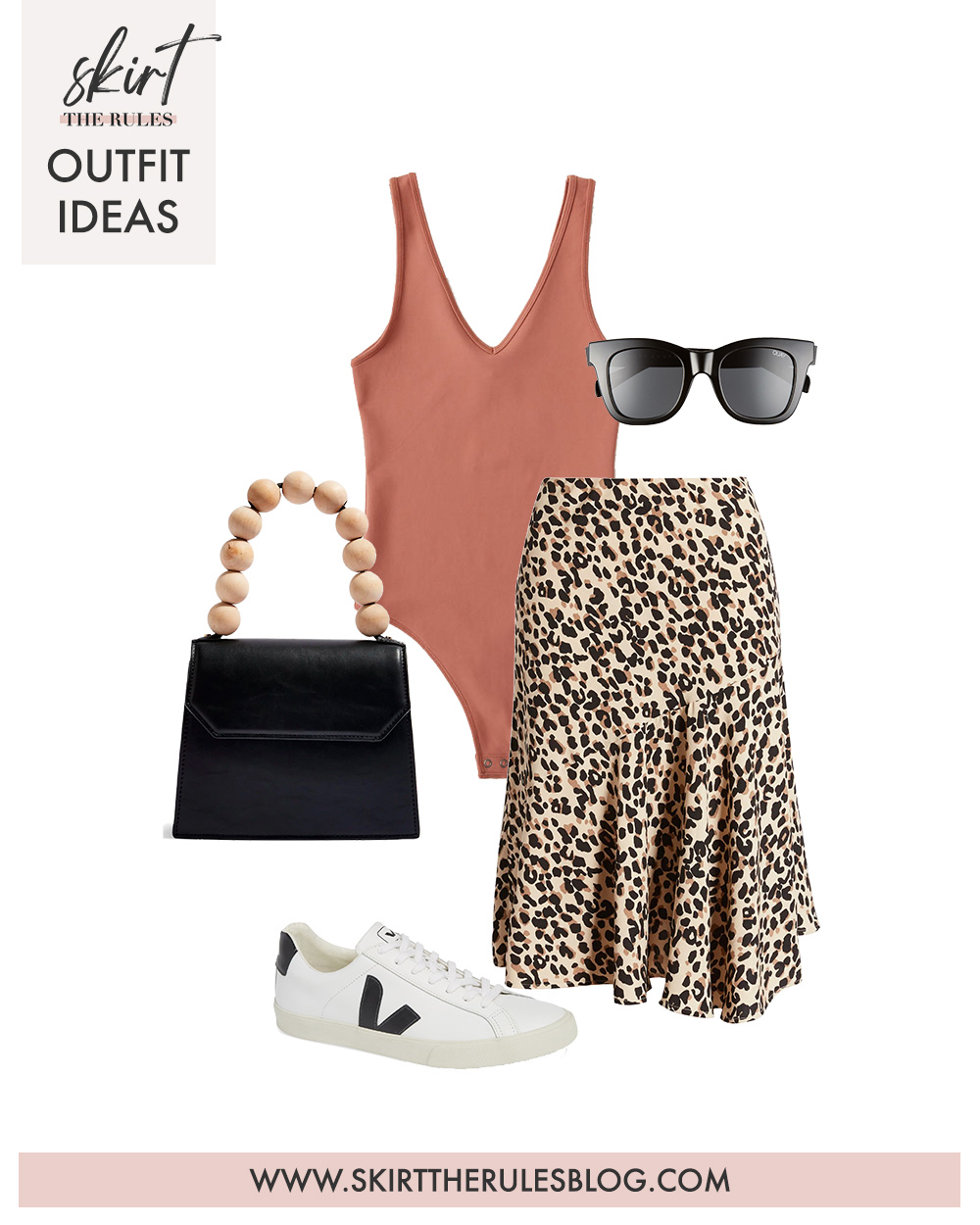 Terra Cotta Bodysuit / Black Oversized Sunglasses / Leopard Midi Skirt / Purse with Wooden Bead Handle / Veja V-10 Sneakers