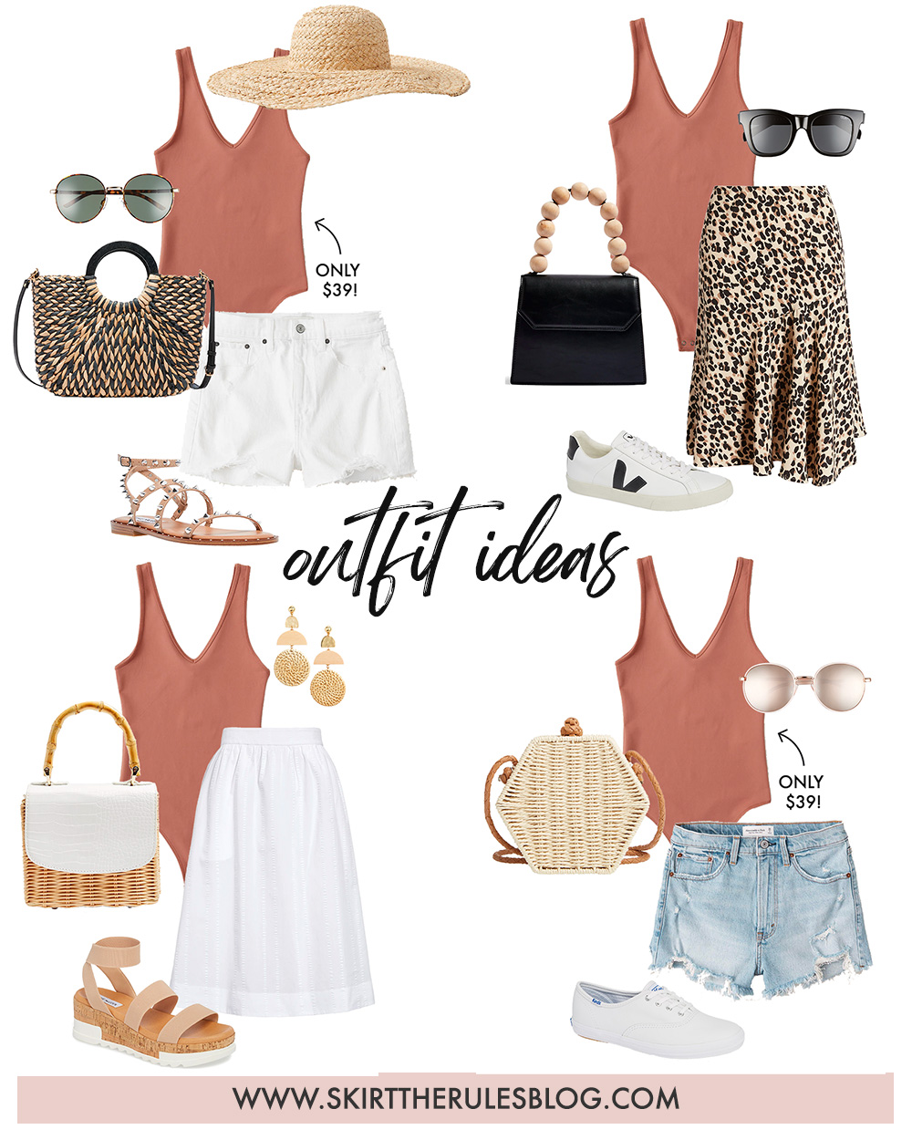 Terra Cotta Bodysuit / Straw Floppy Hat / Round Tortoise Sunglasses / Black Woven Straw Tote Bag / White High Waisted Jean Shorts / Studded Strappy Sandals
