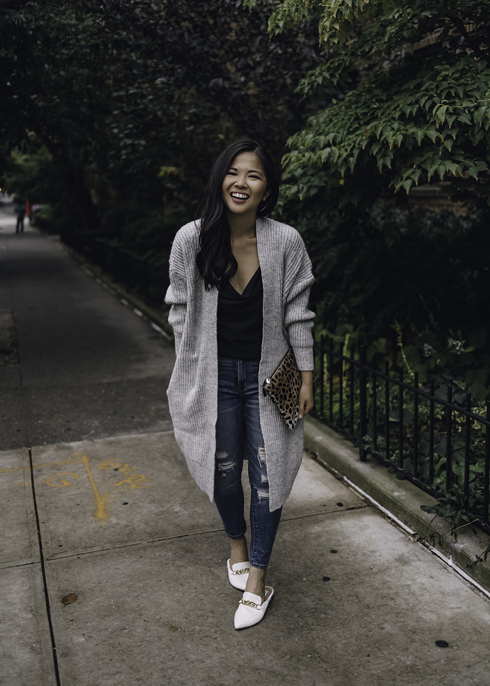 Grey Oversized Cardigan (XS – on sale for $45) / Black Cowl Neck Satin Cami (4 – on sale for $20) / Similar Leopard Clutch / High Waisted Ripped Jeans / White Pointed Toe Mules (sized up to a 7 – on sale for $50)
