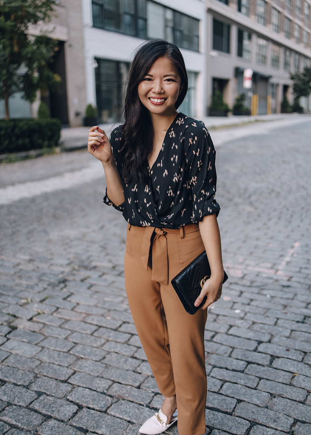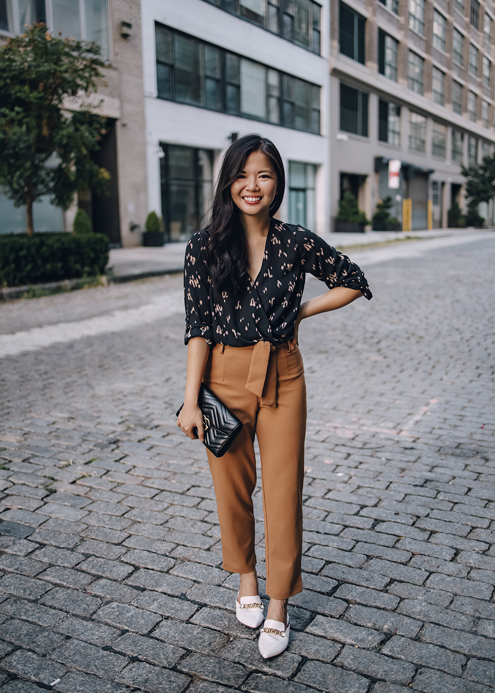 Black Printed 3/4 Sleeve Blouse (XS) / Camel High Waisted Pants (XS) / Gucci Marmont Wallet on Chain / White Loafer Mules (sized up 1/2 size to a 7)