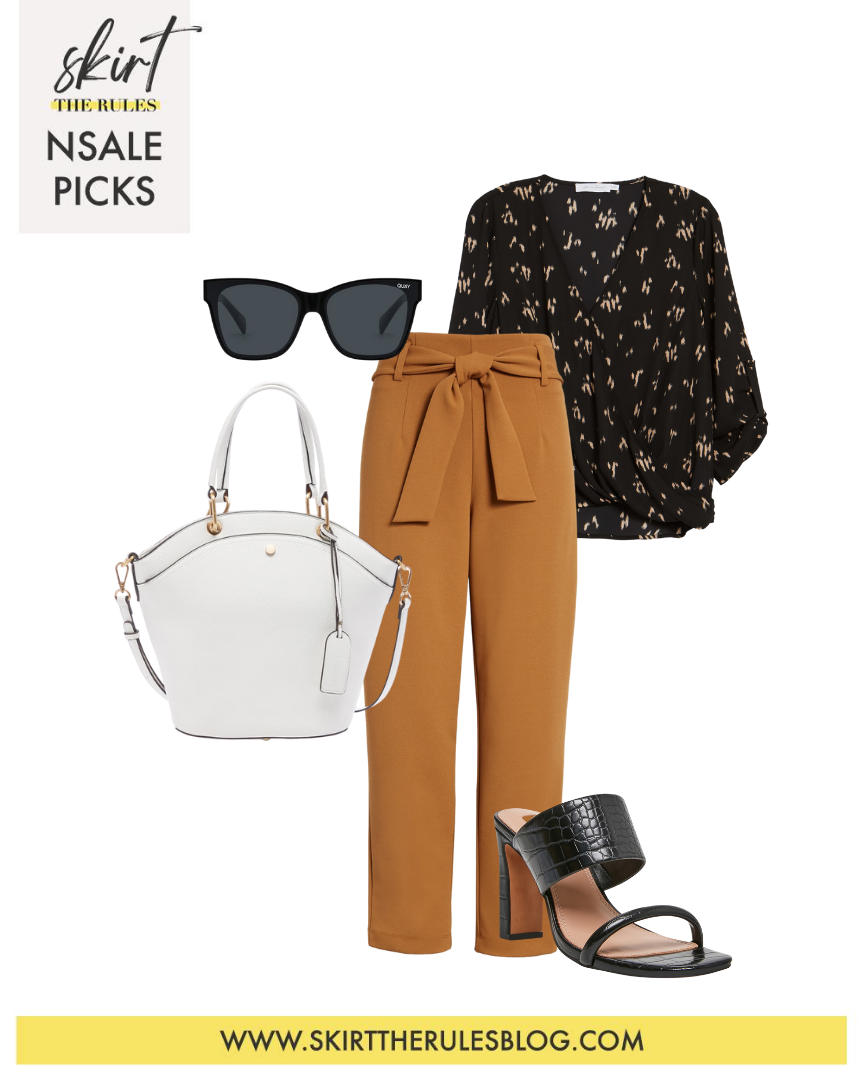 Black Printed 3/4 Sleeve Blouse / Camel High Waisted Pants / Black Sunglasses / White Bag / Black Strappy Mules