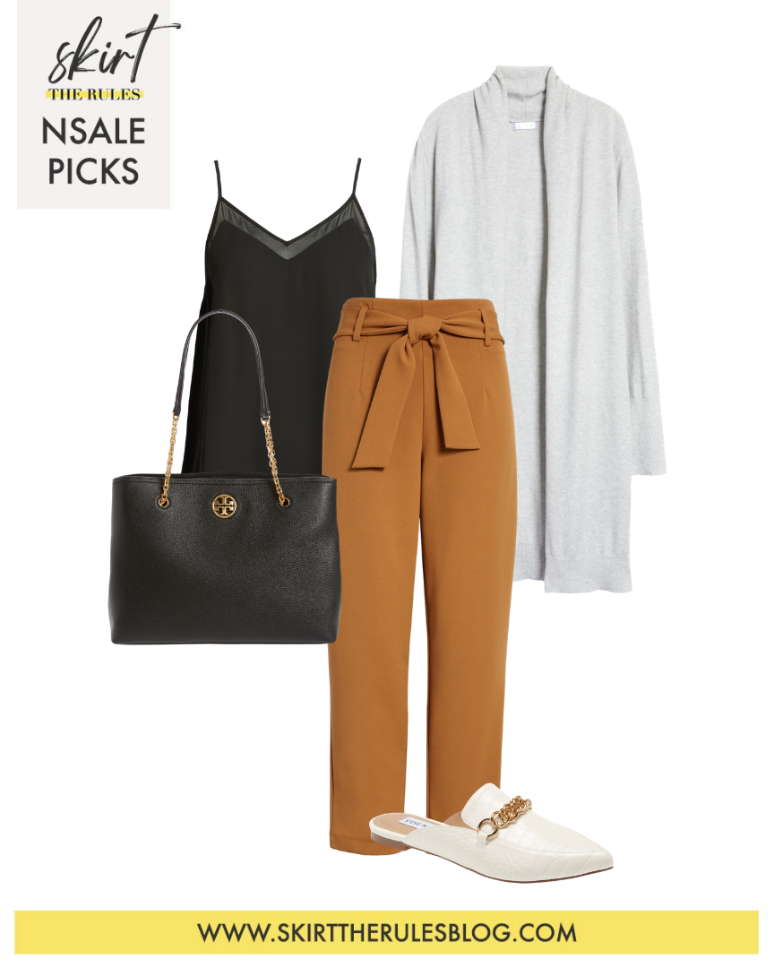 Grey Cardigan / Black Cami / Camel High Waisted Pants / Black Tory Burch Tote Bag / White Loafer Mules