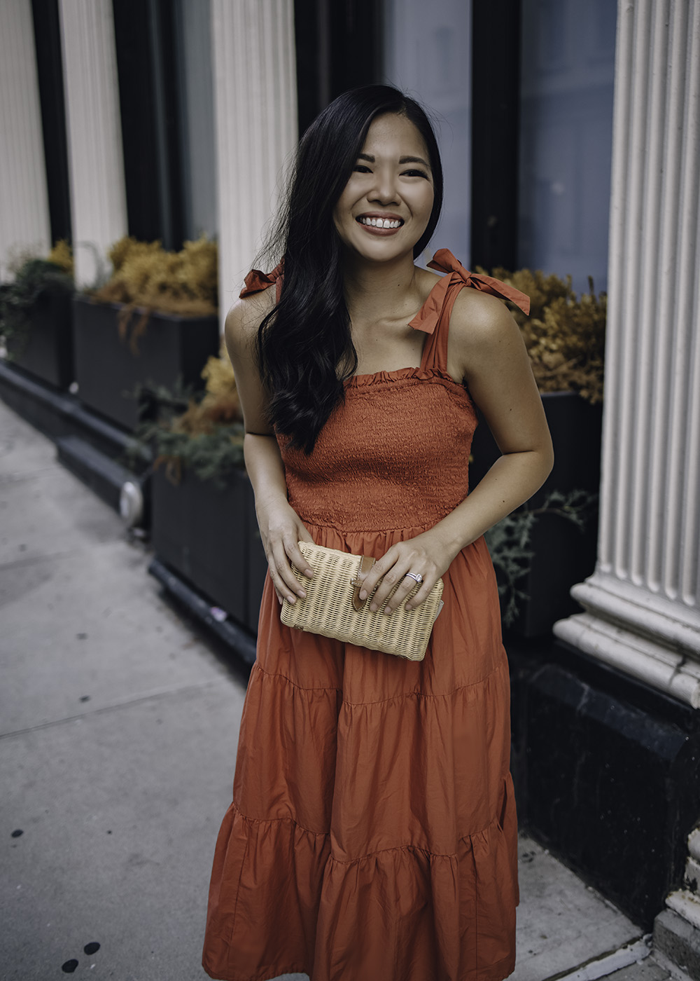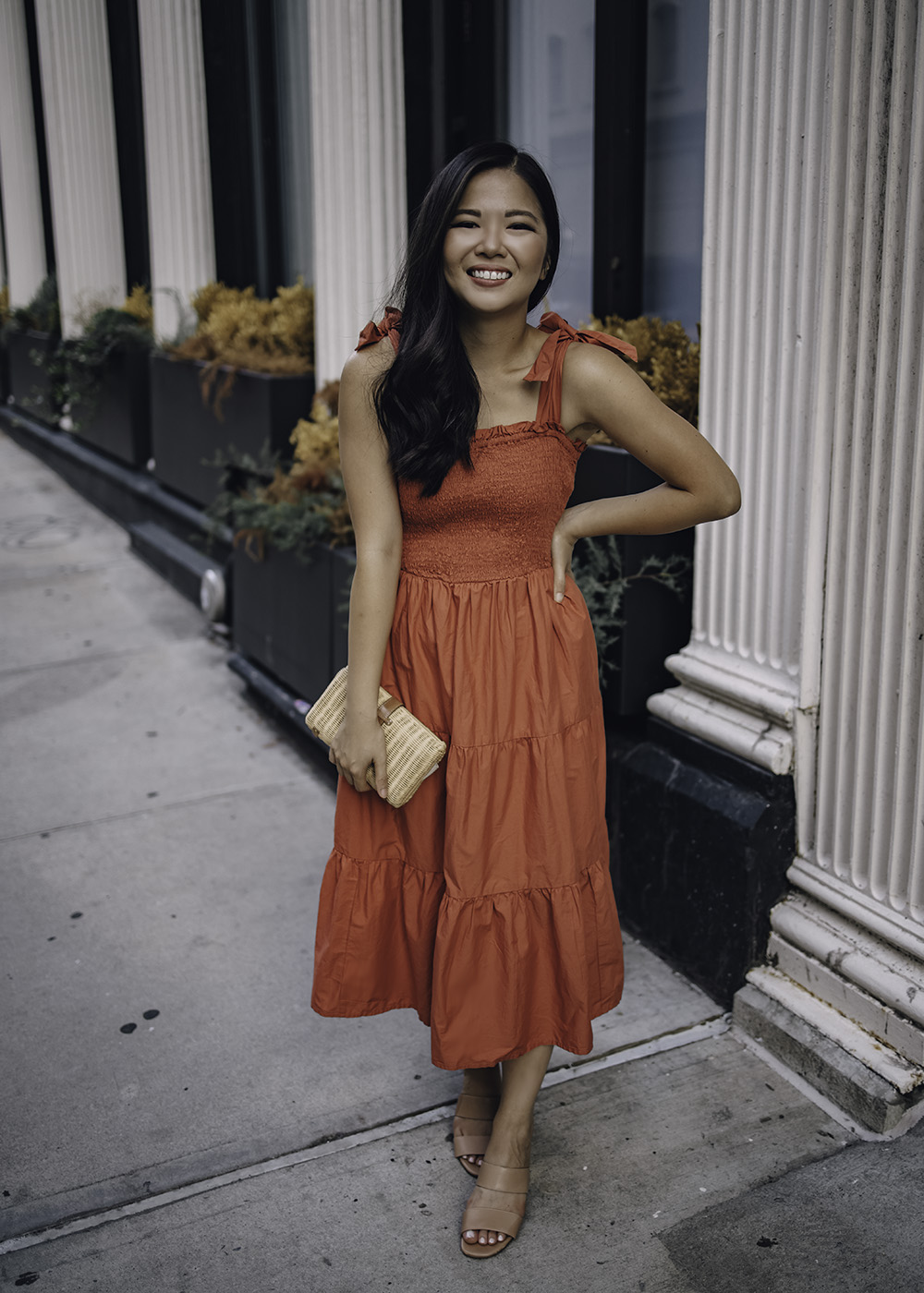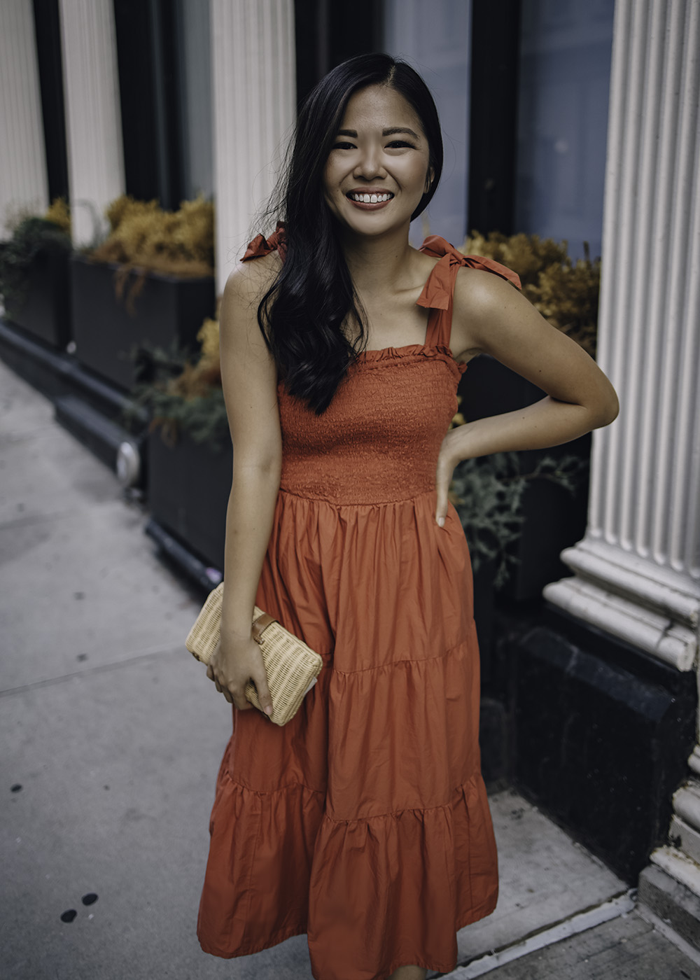 Burnt Orange Midi Dress with Tie Straps (XS) / Rattan Clutch / Similar Tan Leather Mules / Charlotte Tilbury Lipstick in ‘Pillowtalk’