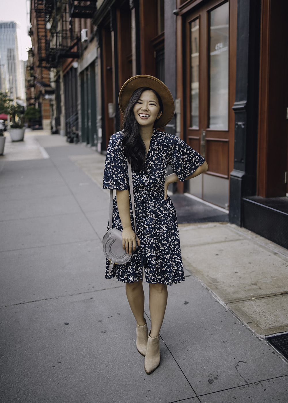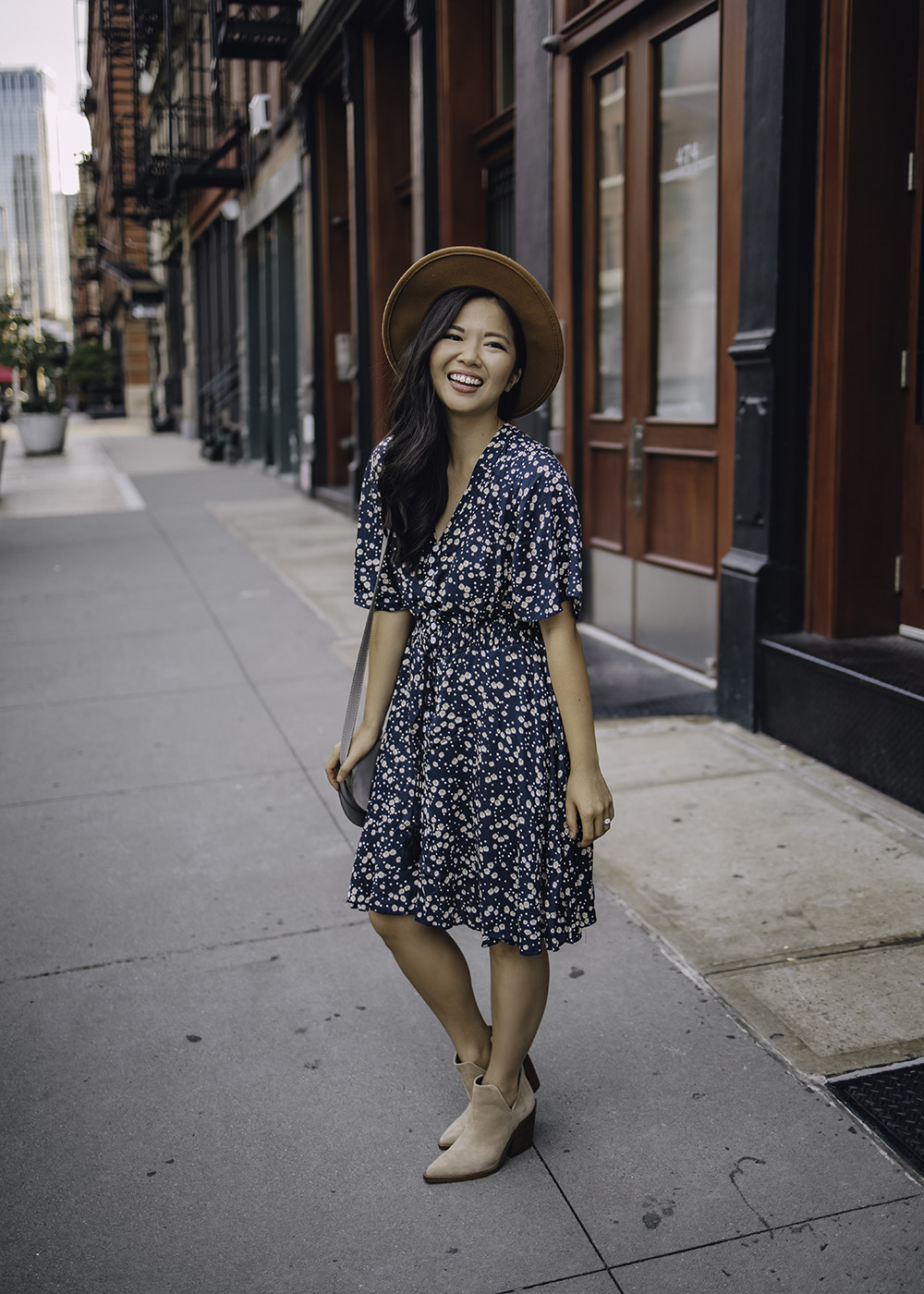 If it’s still warm where you are, this outfit will get you in the fall spirit without breaking a sweat. Summery clothes in darker clothes are a great way to transition between seasons (love this burgundy and brown combo from earlier in the week). Then, add fall accessories like this brown felt hat and these ankle booties – and maybe a pumpkin spice latte to for the full effect.