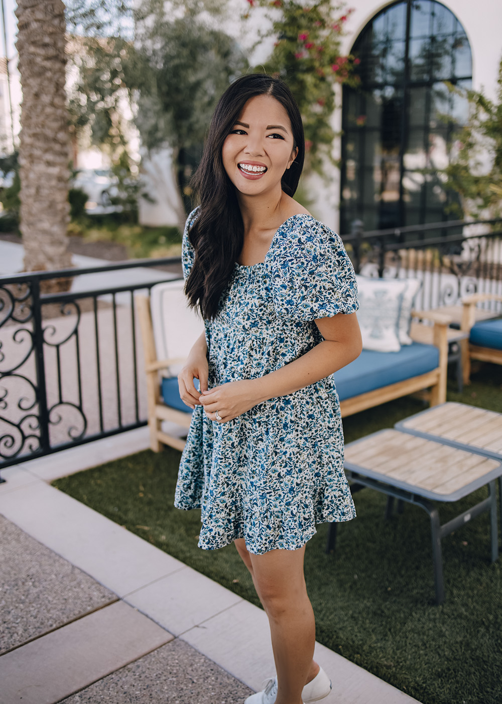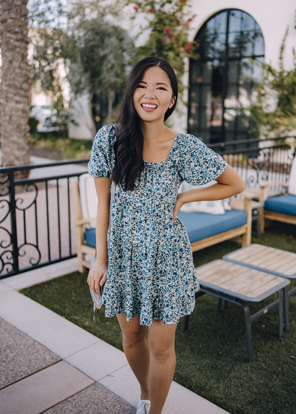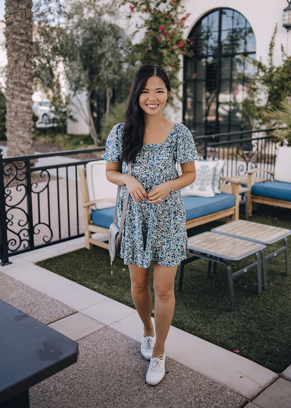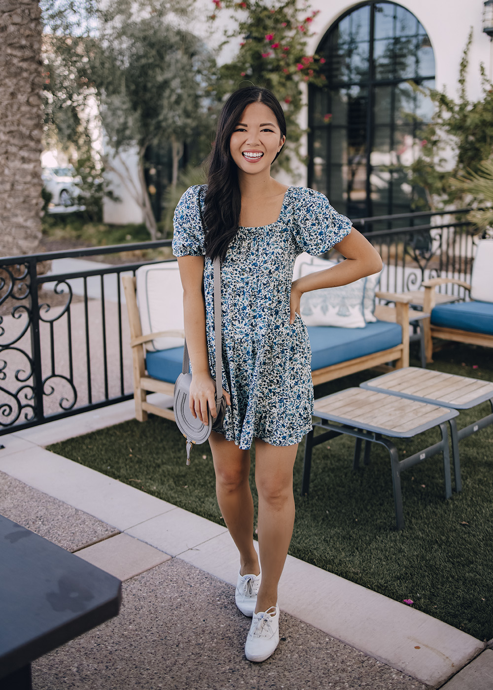 Blue Floral Dress with Puff Sleeves (XS – only $25) / Chloe Marcie Crossbody Bag / White Leather Sneakers (6.5 TTS) / Charlotte Tilbury Lipstick in ‘Pillow Talk’