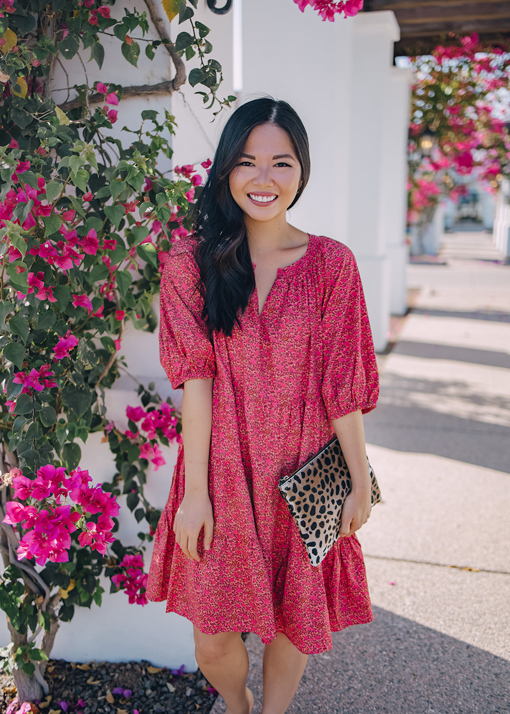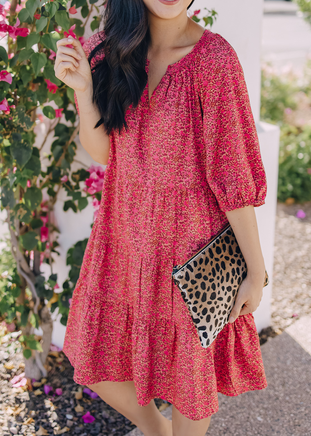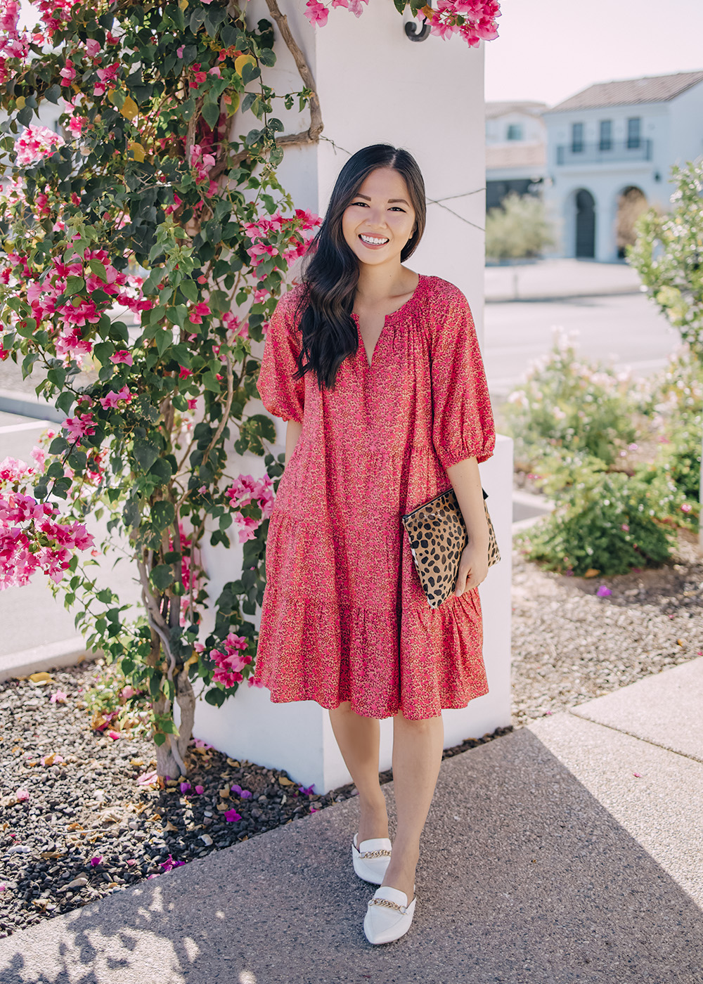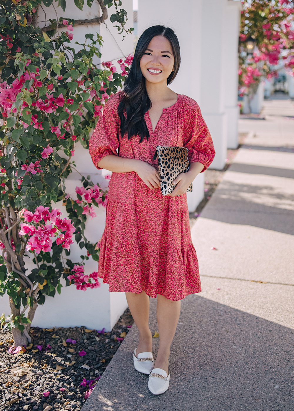 Pink Floral Dress (XS) / Leopard Clutch (similar here) / White Mules (size up 1/2 size) / Charlotte Tilbury Lipstick in ‘Pillow Talk’