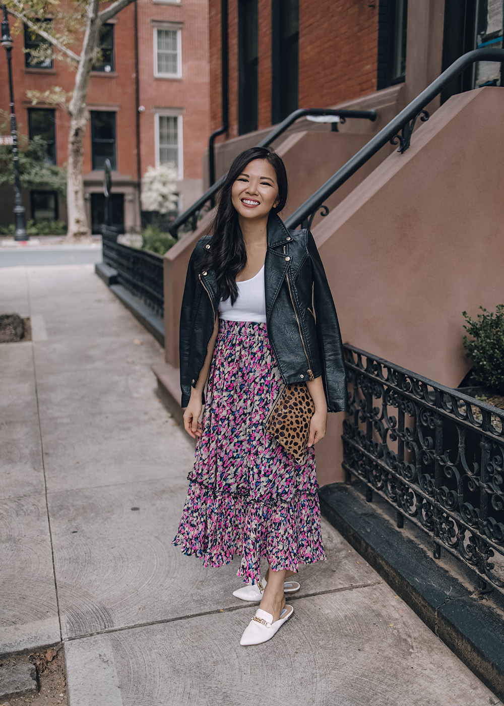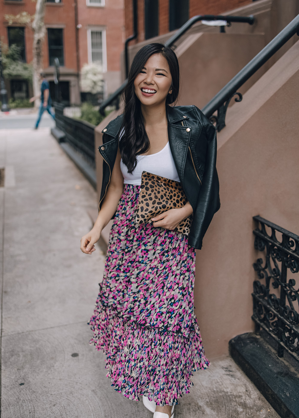 Left: Faux Leather Moto Jacket (XS) / White Tank Top (XS) / Purple Floral Maxi Skirt (4 – also available here) / Leopard Clutch / White Mules (size up 1/2 size) / Right: Black Mock Neck Bodysuit (XS) / Purple Floral Maxi Skirt (4) / Black Circle Bag / Similar Leopard Ankle Strap Heels