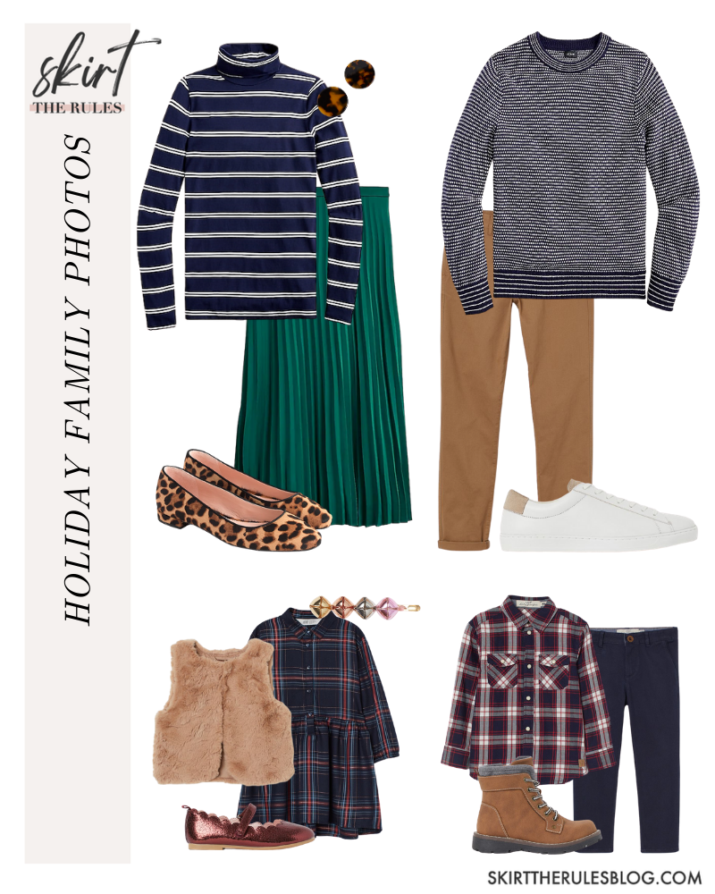 Mom: Navy Striped Turtleneck Top / Tortoise Circle Earrings / Emerald Green Pleated Midi Skirt / Leopard Flats / Dad: Navy Striped Sweater / Dark Khaki Chinos / White Sneakers / Girl: Plaid Dress / Gemstone Hair Clip / Faux Fur Vest / Ruby Flats / Boy: Plaid Button Up Shirt / Dark Navy Chinos / Brown Boots
