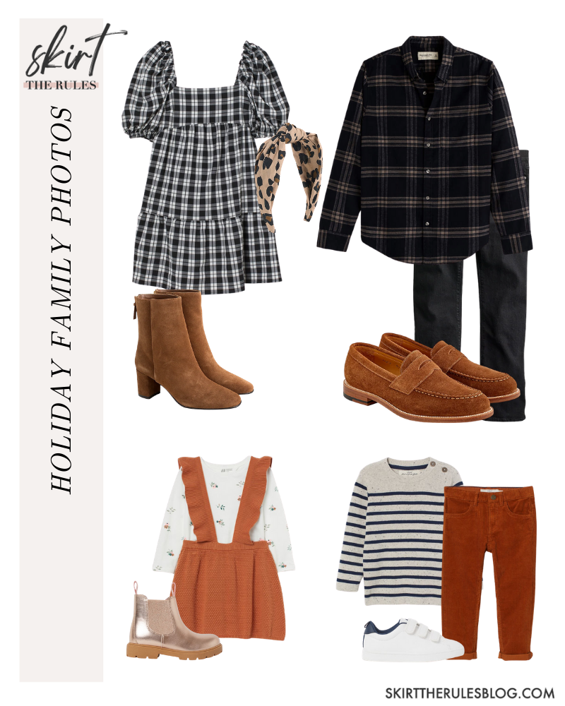 Mom: Plaid Dress with Puff Sleeves / Leopard Headband / Brown Suede Ankle Booties / Dad: Black Plaid Shirt / Black Jeans / Brown Suede Loafers / Girl: Brown Floral Dress / Rose Gold Chelsea Boots / Boy: Navy & Grey Striped Sweater / Brown Corduroy Pants / White Sneakers