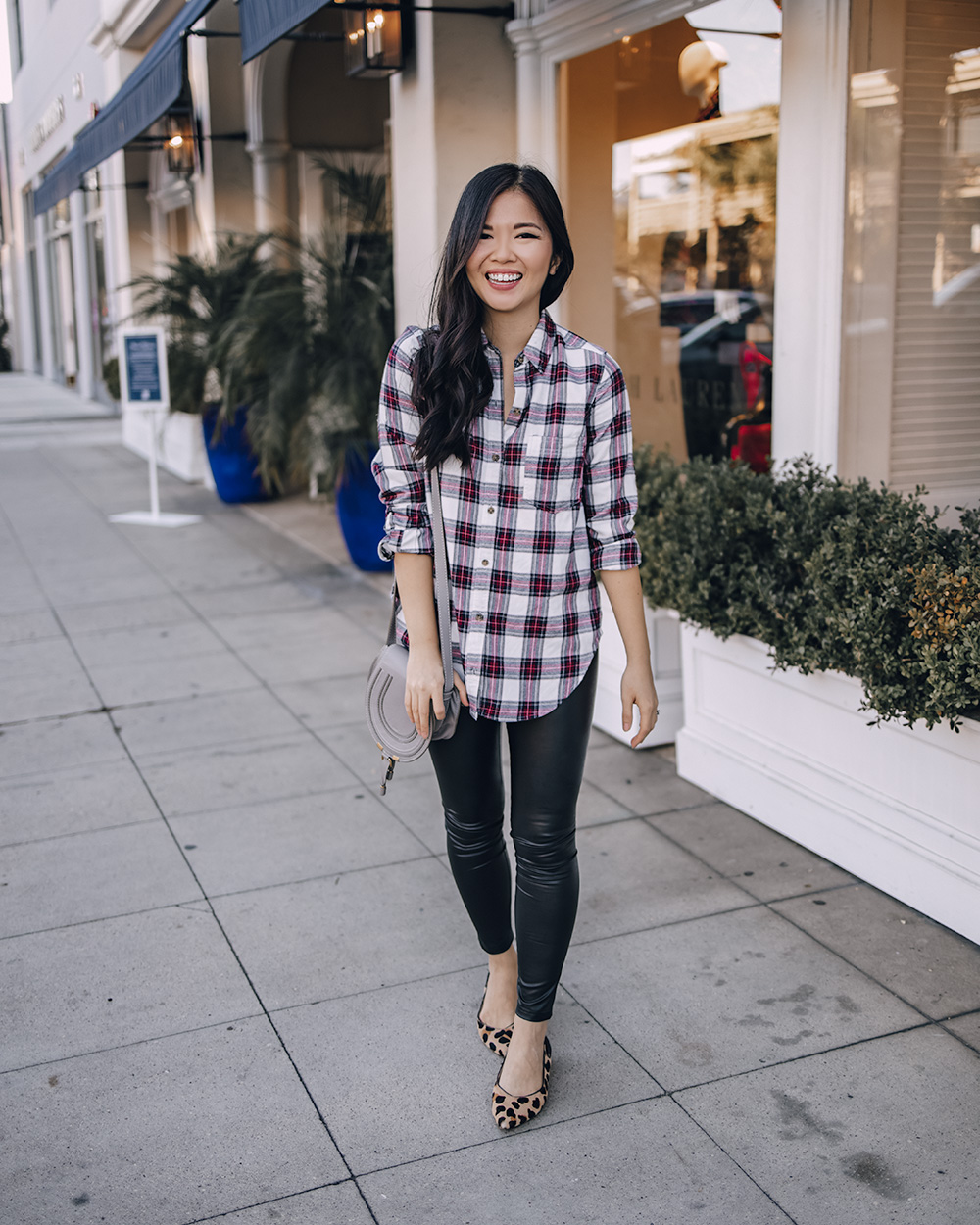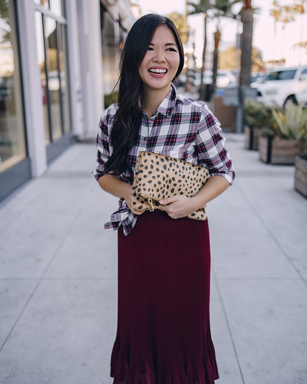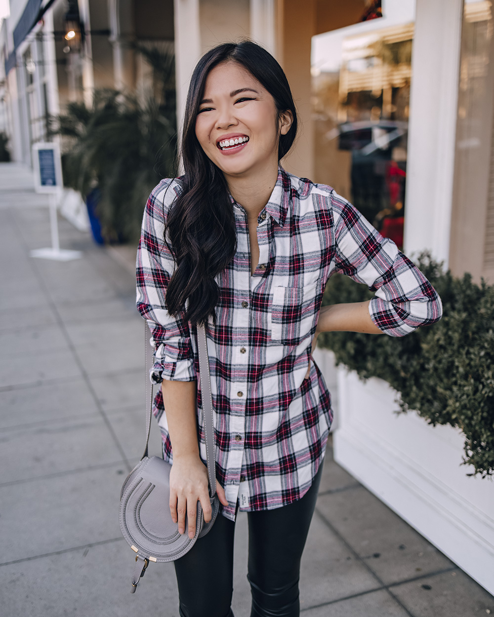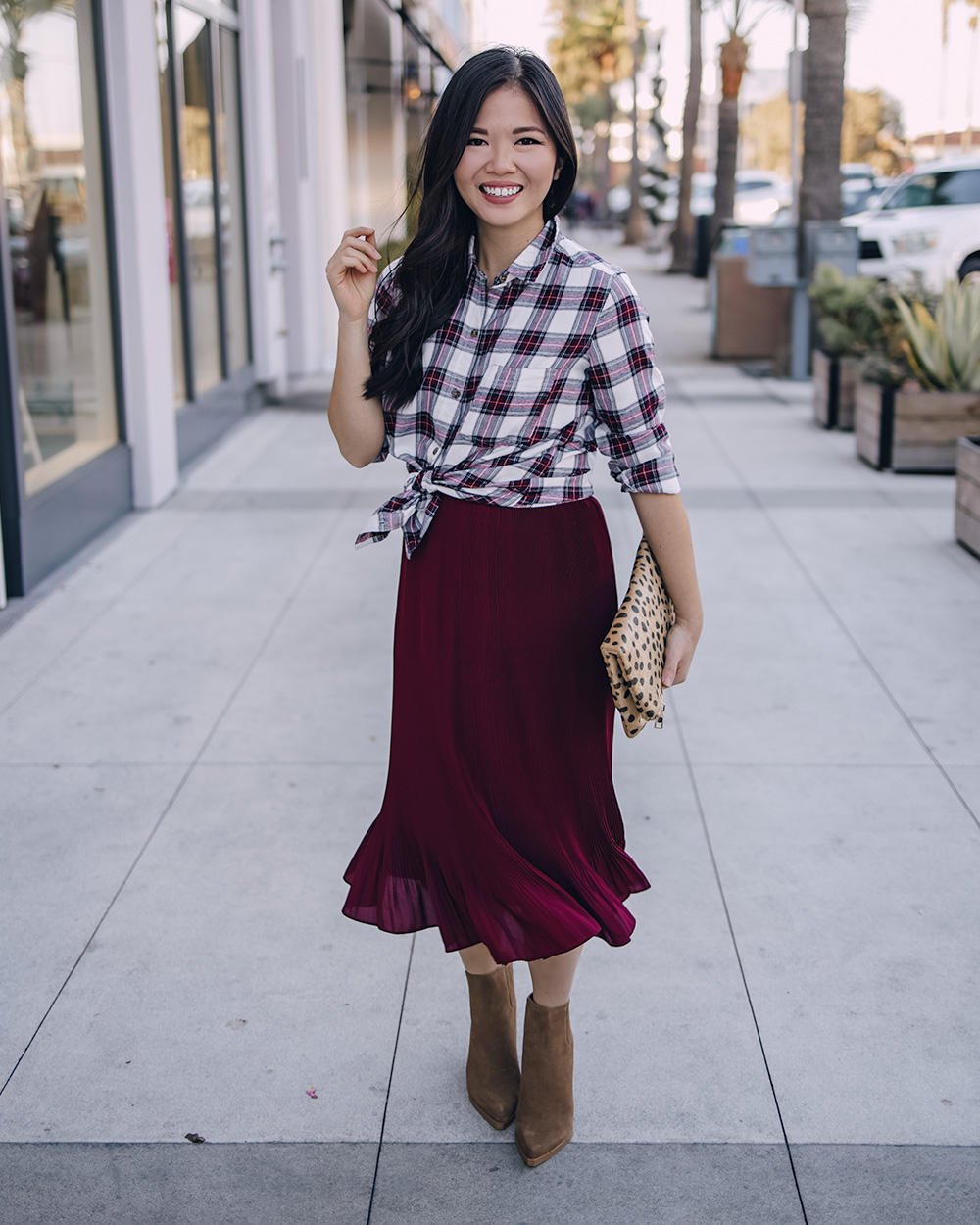 This flannel shirt is incredibly soft and comes a few different colors, but I especially love this red, navy and white combo. It feels festive, without looking overly holiday, which means you can wear it long after December is over. I love it paired with faux leather leggings for a laidback look and this burgundy pleated midi skirt for a more festive feel. Which outfit would you wear?
