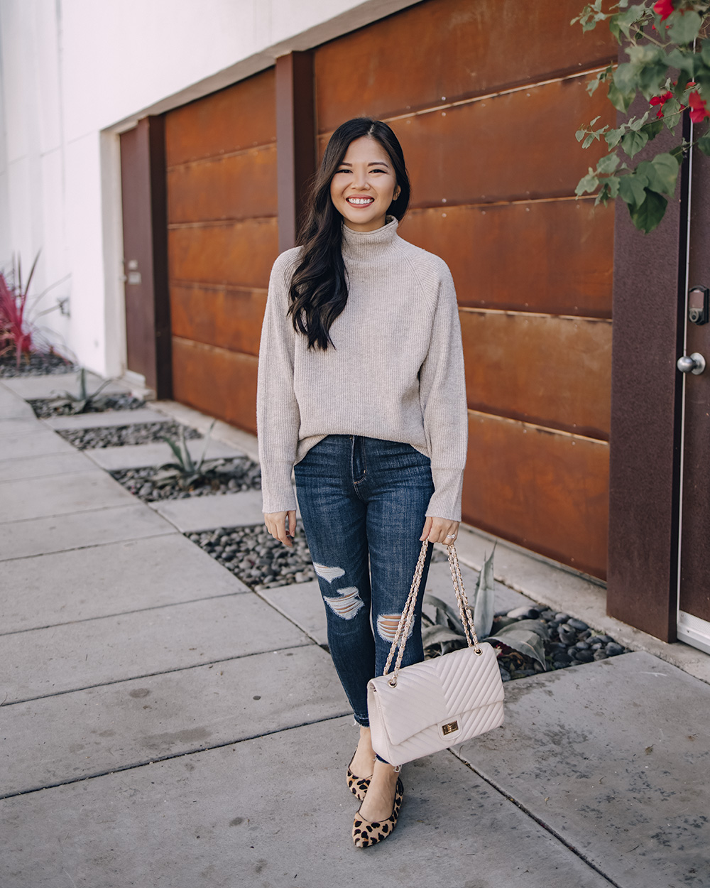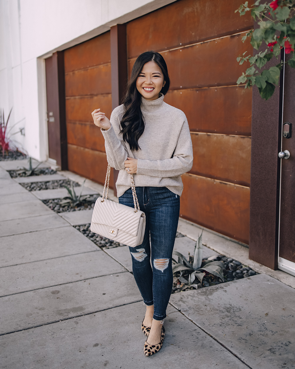 Taupe Turtleneck Sweater (XS) / Quilted Cream Bag with Gold Chain / High Rise Dark Wash Skinny Jeans (26S) / Similar Leopard Flats / Charlotte Tilbury Lipstick in ‘Pillow Talk’
