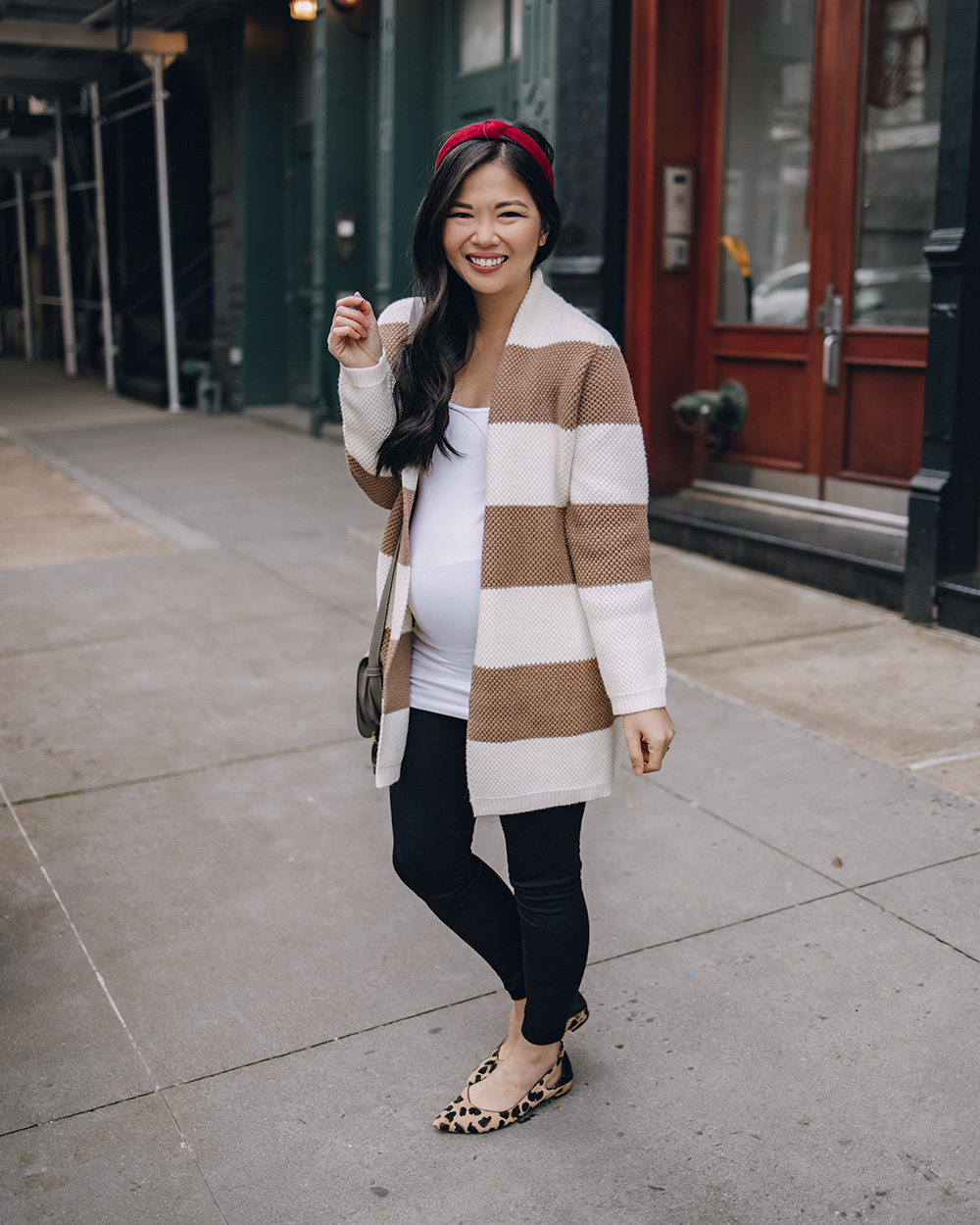 Left: Tan & White Striped Cardigan (c/o) (XS petite) / Black Tank Top (XS) / Beige High Waisted Pants (c/o) (6) / Black Suede Pumps (6.5 TTS) / Right: Tan & White Striped Cardigan (c/o) (XS petite) / White Maternity Cami (XS) / Maroon Knotted Headband / Black Maternity Leggings (c/o) (one size) / Similar Leopard Flats