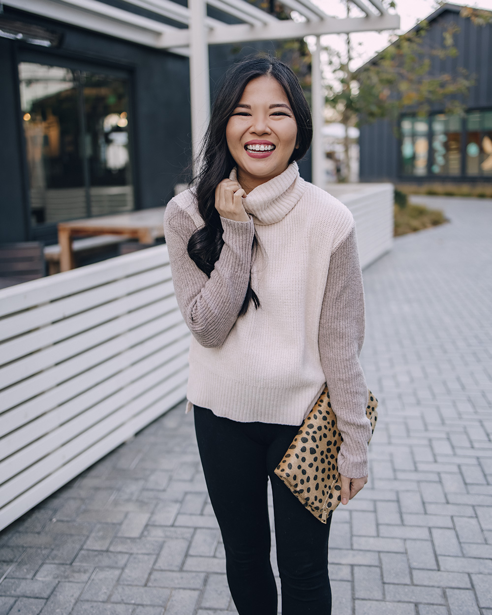 This combo is pretty much the only thing I wear to work, run errands or hang out on weekends these days – especially now that I’m pregnant. I am 100% a member of the “Leggings are Pants” club and while I usually go for longer tunic length sweaters, I’ll make exceptions for sweaters like this colorblocked cutie. I love the neutral color combo and the fact that it’s super soft – and for what it’s worth, it would be super cute with a pair of jeans too!