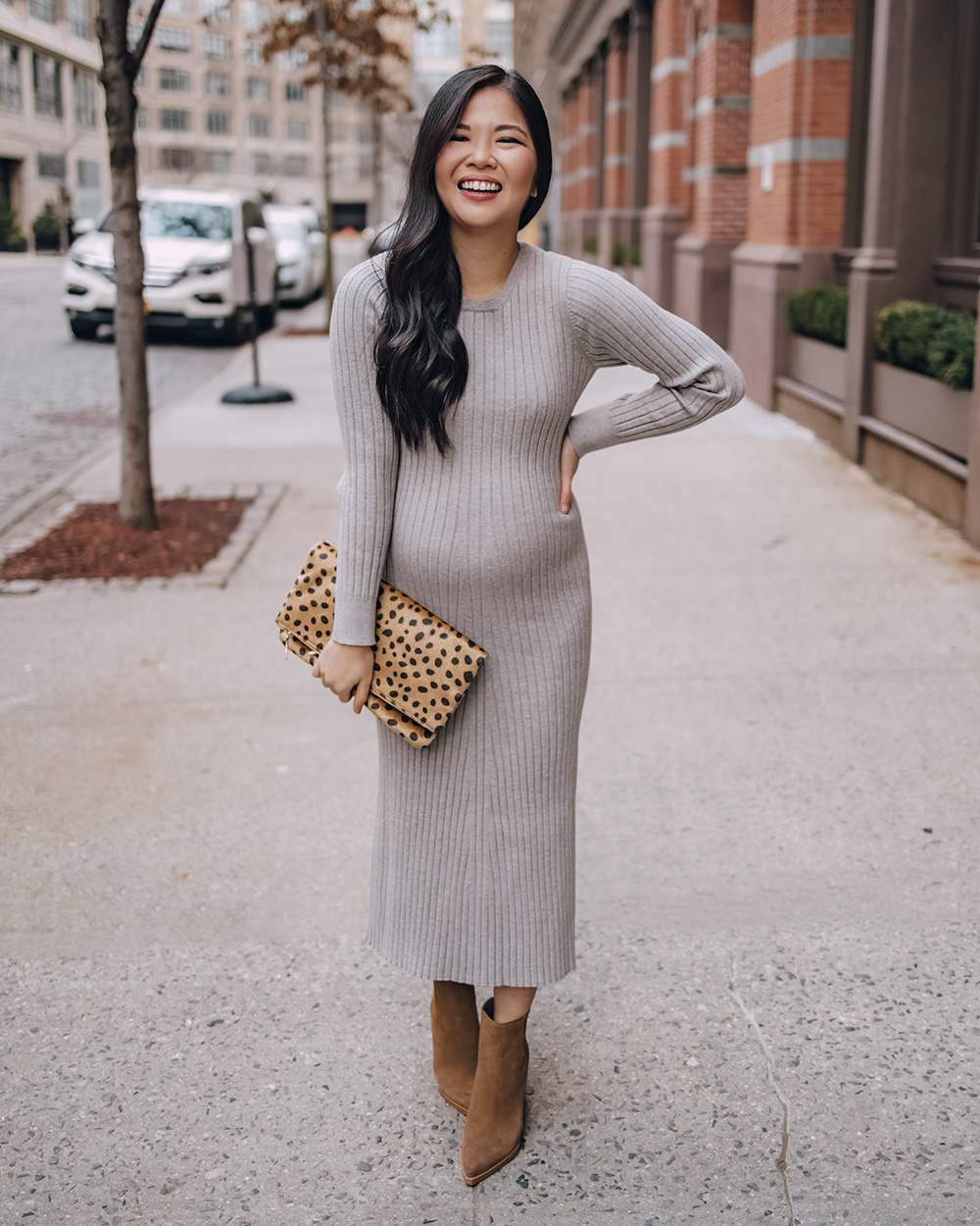 If you’ve got a winter bump like me (I was 21 weeks when we took these photos), then sweater dresses will be your best friend. The fabric tends to have a bit more give in places where you’ll need (think bump and booty!), but also looks great without the bump. I love the midi length of this gray sweater dress because it’s elongating and the leg slit gives this outfit a bit of va va voom! The best part is that it’s 40% off right now, available in all sizes and also comes in plus sizing!