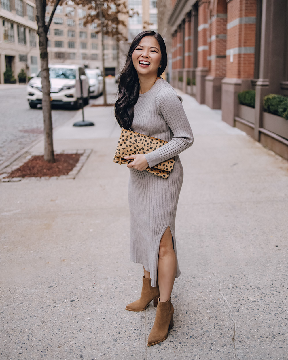Gray Sweater Dress (XS – on sale for $47 and also comes in plus sizes) / Leopard Clutch / Brown Suede Ankle Boots (sized up 1/2 size – on sale for $100) / Charlotte Tilbury Lipstick in ‘Pillow Talk’