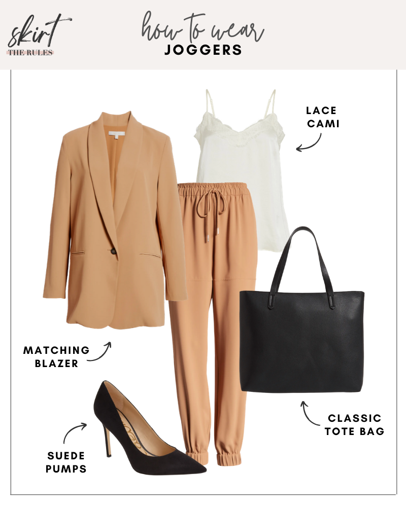 camel blazer / white lace top / camel jogger pants / black tote bag / black suede pumps