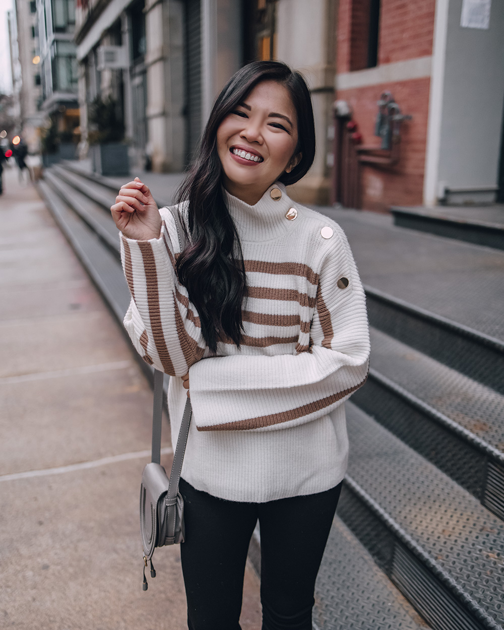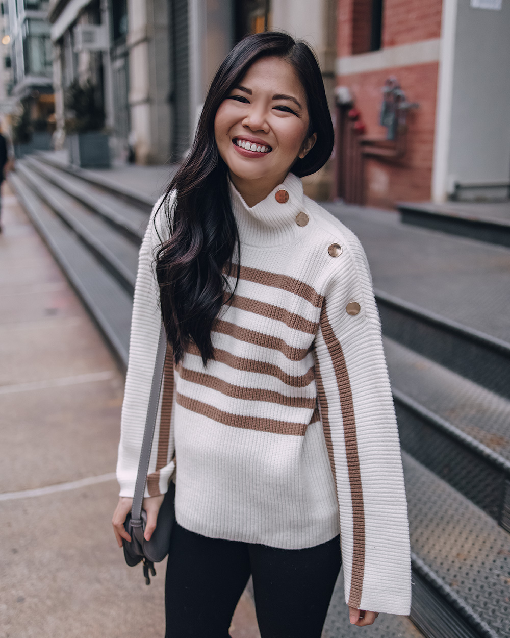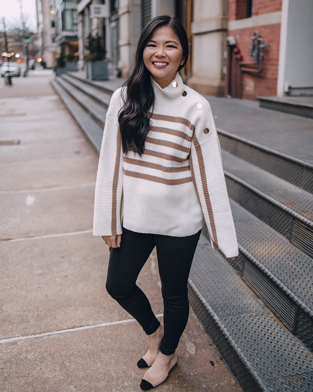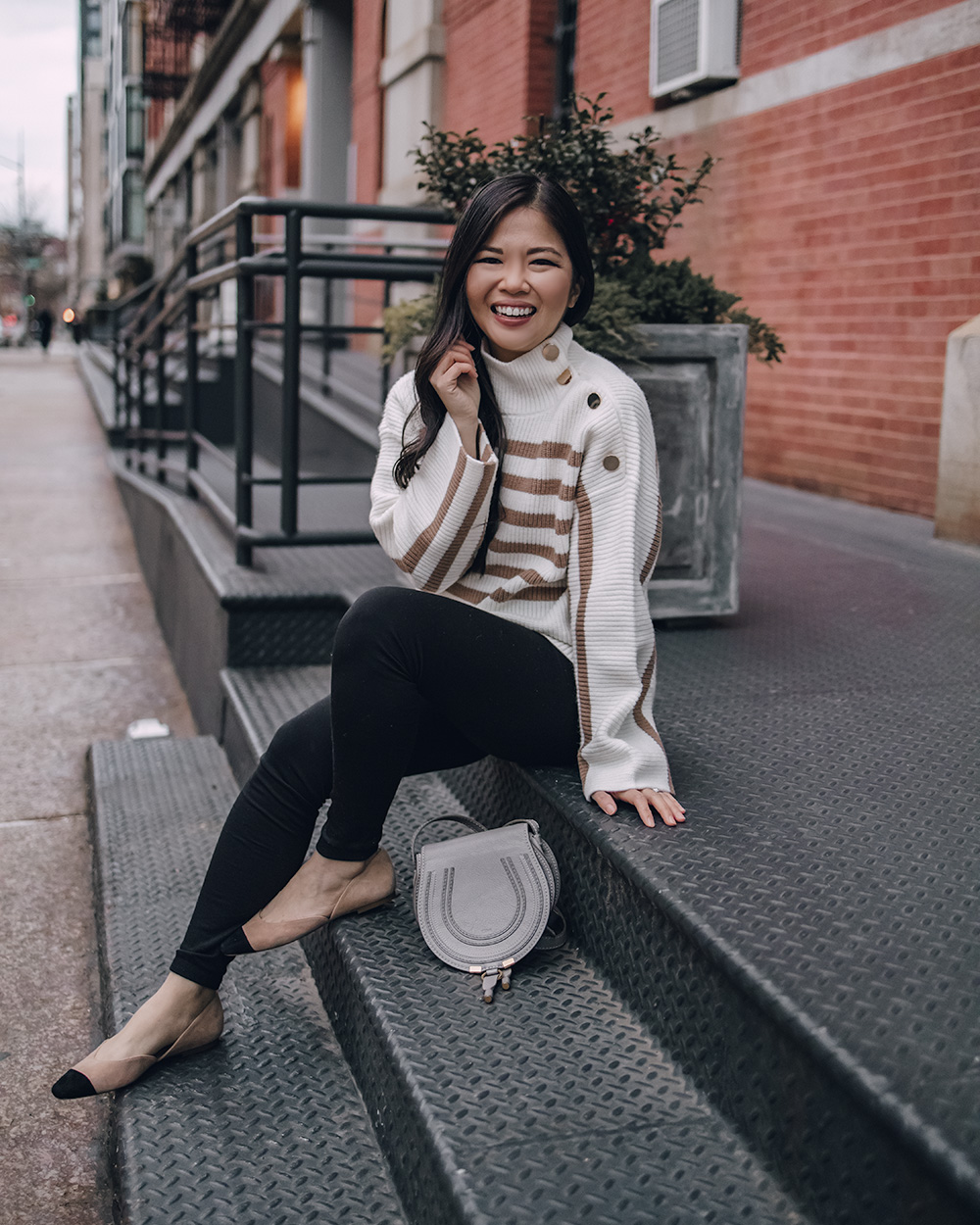 Tan Striped Sweater with Gold Buttons (c/o – sized up to an S for the bump, but otherwise TTS) / Black Maternity Fleece Lined Leggings (c/o) (here are my favorite non-maternity leggings) / Chloe Mini Marcie Bag / Black & Beige Cap Toe Flats (c/o – 6.5 TTS) / Charlotte Tilbury Lipstick in ‘Pillow Talk’