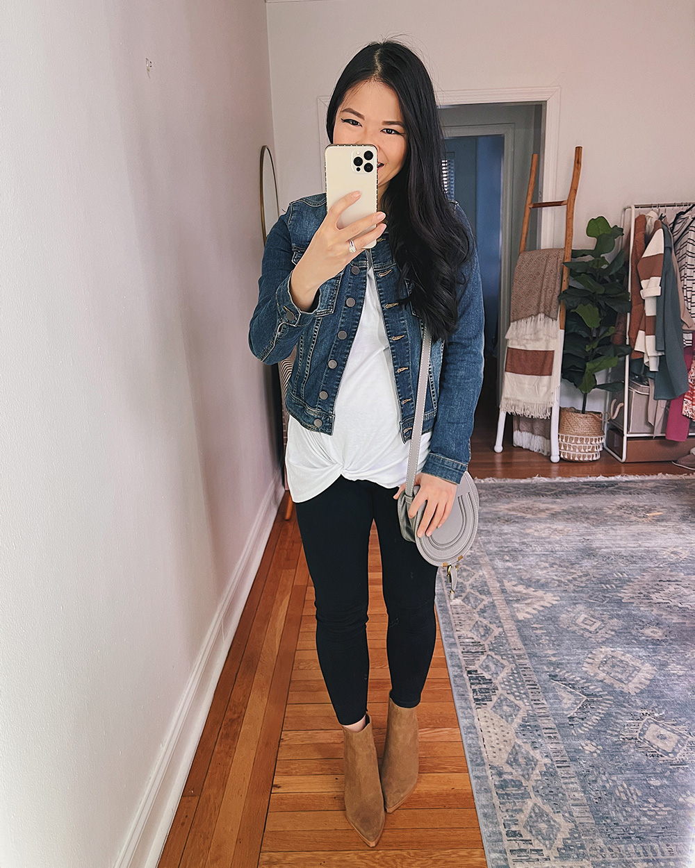 Dark Wash Denim Jacket (XS) / White Long Sleeve T-Shirt with Twist Front (S) / Black Maternity Fleece Lined Leggings (one size) / Chloe Mini Marcie Gray Crossbody Bag / Marc Fisher Oshay Brown Suede Ankle Booties (size up 1/2 size)