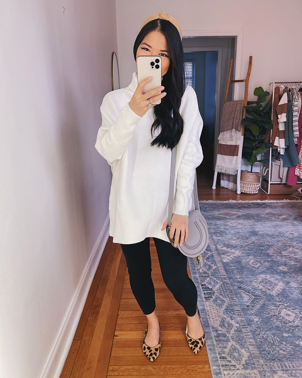 White Turtleneck Tunic Sweater (XS – runs very oversized!) / Black Maternity Fleece Lined Leggings (one size) / Beige Knotted Headband ($10 for a pack of 10 colors!) / Chloe Mini Marcie Gray Crossbody Bag / Similar Leopard Flats