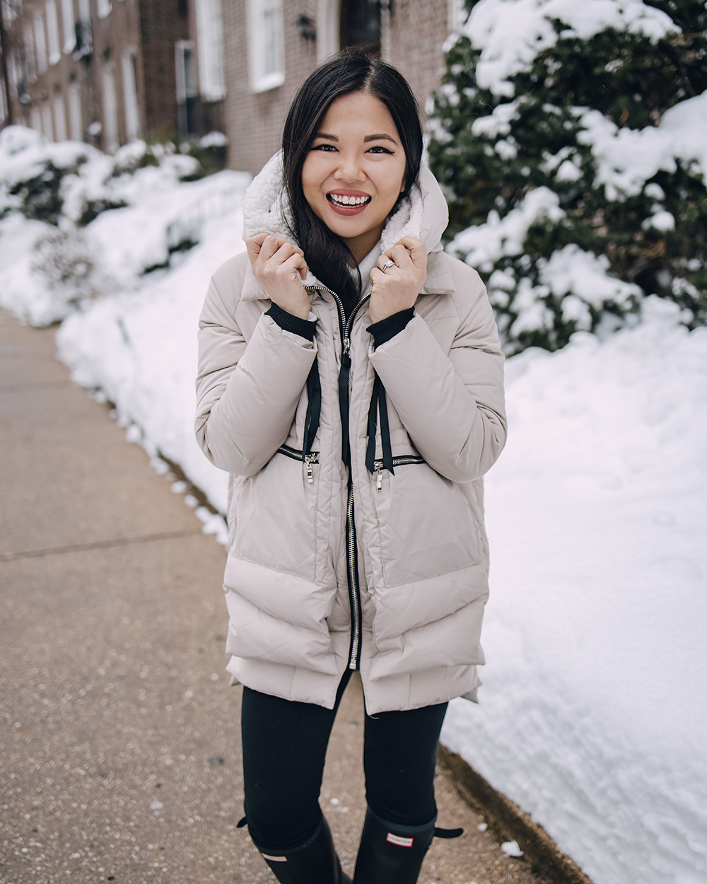 Orolay Puffer Jacket (XS – comes in 6+ colors) / White Mock Neck Sweater (XS) / Black Maternity Fleece Lined Leggings (c/o) (here are my favorite non-maternity leggings) / Hunter Tour Packable Rain Boots (normally a 6.5, sized up to a 7) / Charlotte Tilbury Lipstick in ‘Pillow Talk’