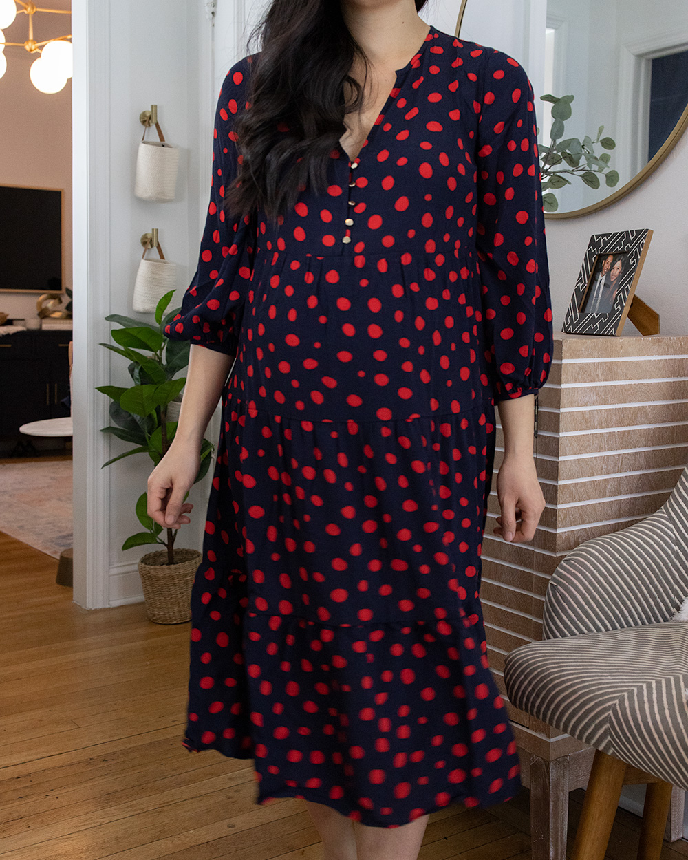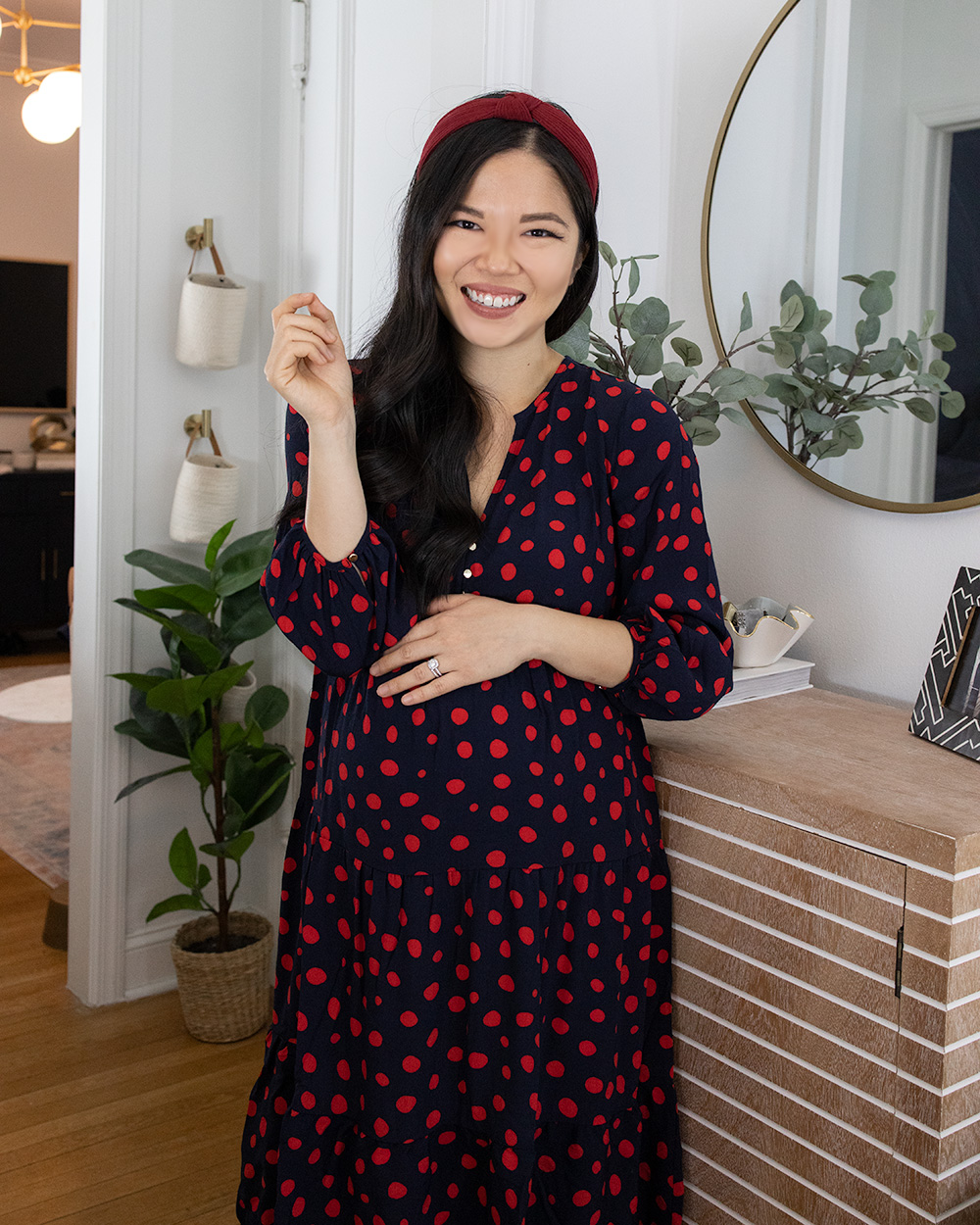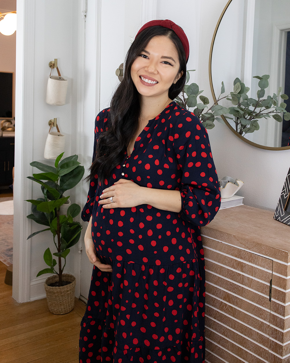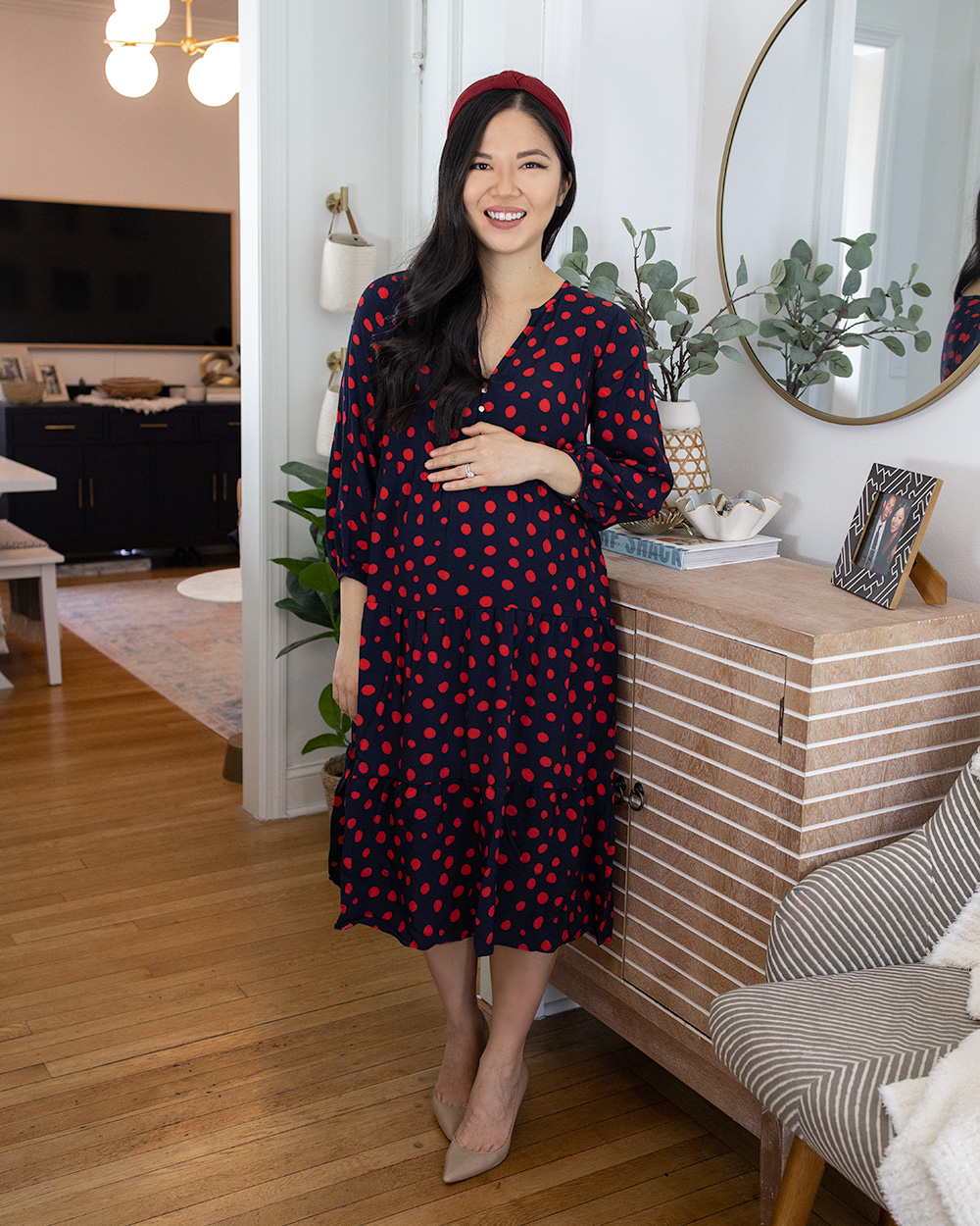 Outfit: Navy and red polka dot dress (SP) / Burgundy knotted headband ($10 for a pack of 10 colors) / Nude pumps (6.5 TTS) / Entryway Decor: Round gold mirror / Striped accent cabinet / Faux eucalyptus branches / Woven vase / Surf Shack coffee table book / Gold hanging hooks / Woven hanging baskets / Faux rubber plant