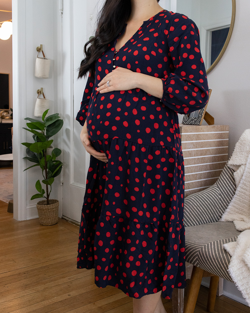 But that didn’t stop me for falling head over heels for this pretty polka dot dress. This darling number is non-maternity, but oh-so bump friendly! The cut and sleeve length makes it perfect for plenty of occasions — work, brunch, church and even date night. It also comes in a bright solid red and this black and white version!