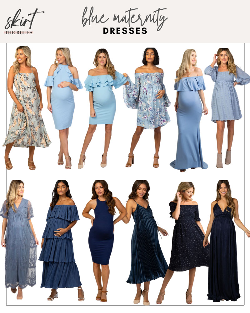Blue Maternity Dresses (L to R): Light Blue Floral Midi Dress / Cold Shoulder Ruffle Dress / Off the Shoulder Mini Dress / Off the Shoulder Bell Sleeve Dress / Ruffle Maxi Dress / Puff Sleeve Mini Dress / Cornflower Blue Lace Maxi Dress / Tiered Ruffle Maxi Dress / Halter Cut Bodycon Dress / Pleated Midi Dress / Off the Shoulder Navy Polka Dot Dress / Strappy Maxi Dress