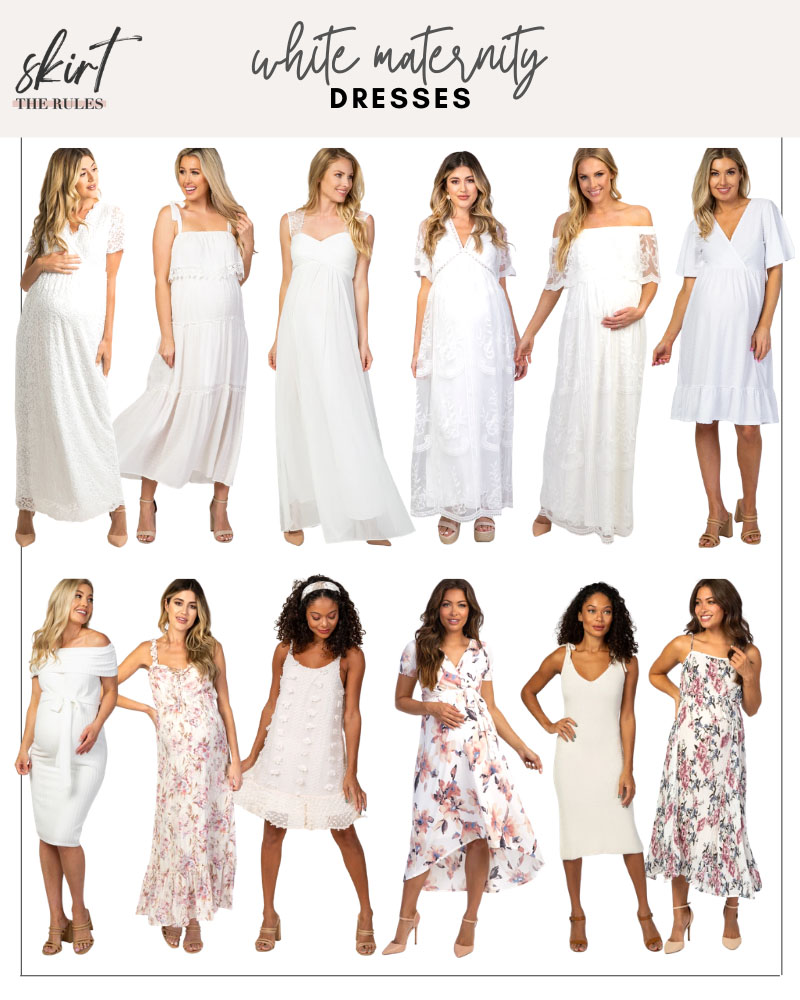 White Maternity Dresses (L to R): Lace Short Sleeve Maxi Dress / Tie Strap Midi Dress / Lace Sleeve Maxi Dress / Romantic Lace Maxi Dress / Off the Shoulder Lace Maxi Dress / Wrap Midi Dress / Off the Shoulder Bodycon Dress / Floral Maxi Dress / Pom Pom Dress / Floral Wrap Midi Dress / Tie Strap Sweater Dress / Floral Spaghetti Strap Midi Dress