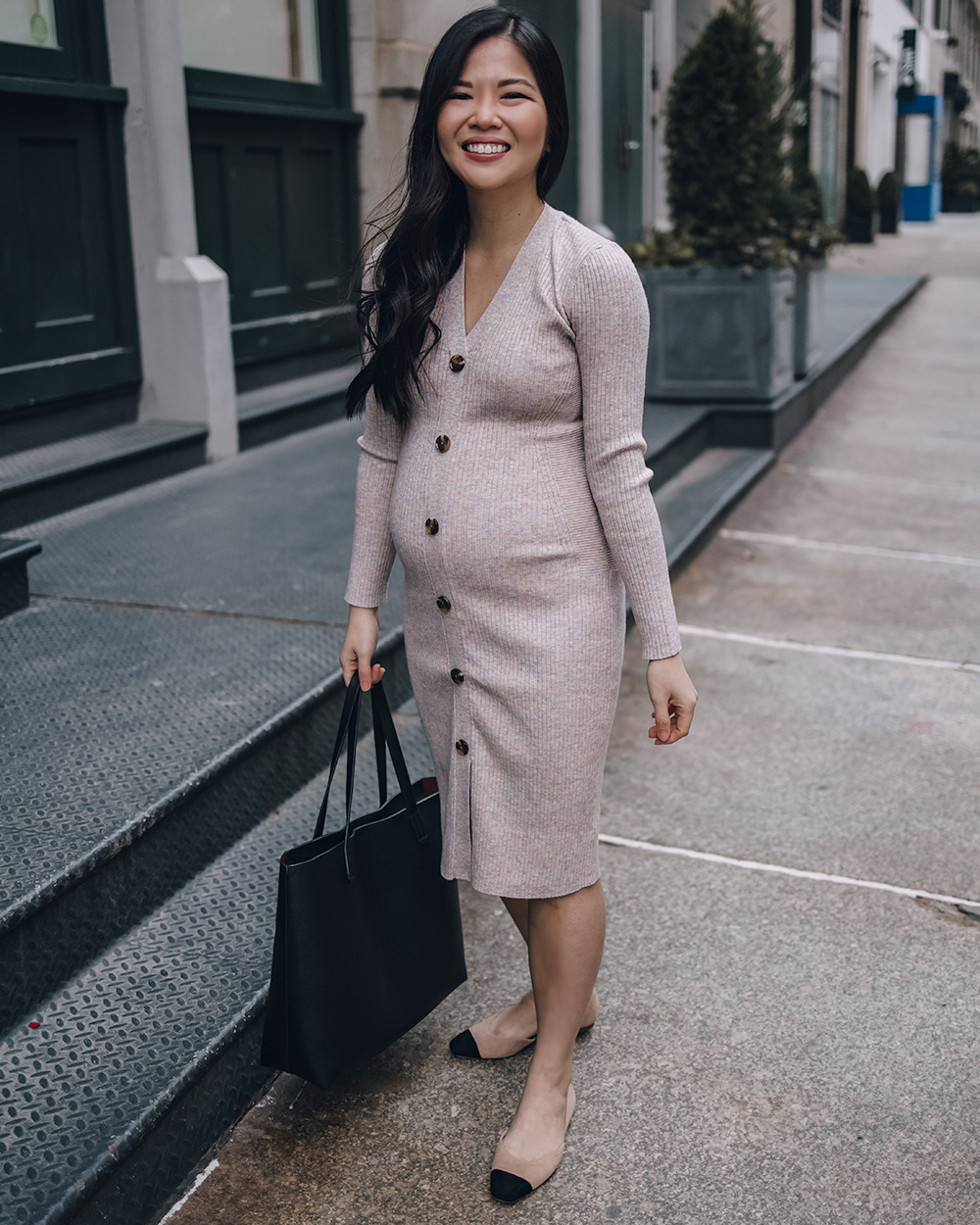 Beige sweater dress (S) / Black tote bag with zipper / Black and beige cap toe flats (6.5 TTS – c/o Ann Taylor) / Charlotte Tilbury Lipstick in ‘Pillow Talk’