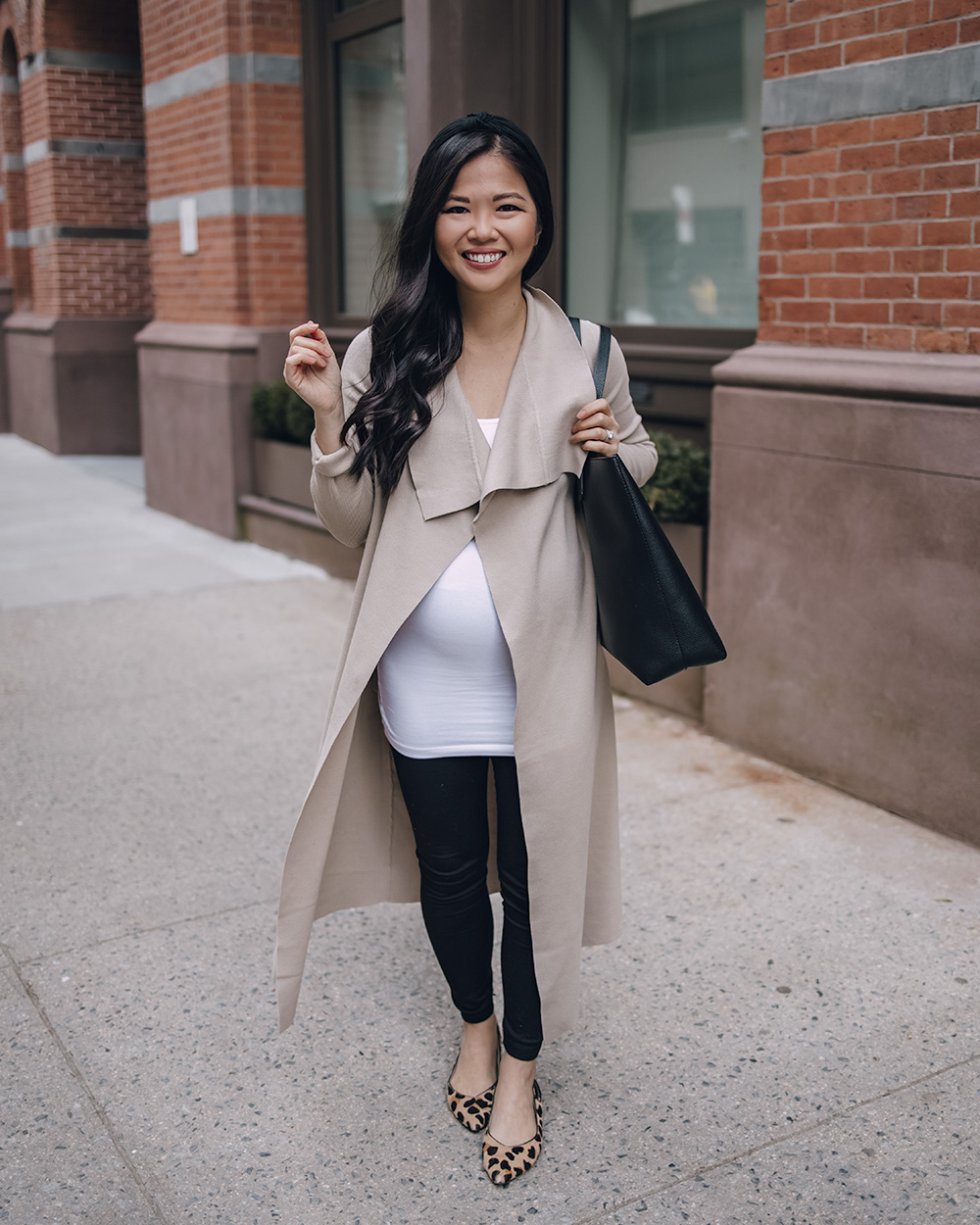 Beige Drapey Jacket (c/o) (4 – use code SKIRT15 for 15% off your entire purchase through 2/22) / White Maternity Cami (XS – also nursing friendly!) / Black Maternity Fleece Lined Leggings (c/o) (here are my favorite non-maternity leggings) / Black Knotted Headband ($10 for 10 colors) / Black Tote Bag with Zipper / Similar Leopard Flats / Charlotte Tilbury Lipstick in ‘Pillow Talk’