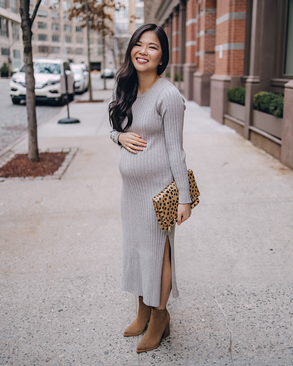 Gray Sweater Dress (XS – on sale for $47 and also comes in plus sizes) / Leopard Clutch / Brown Suede Ankle Boots (sized up 1/2 size – on sale for $100) / Charlotte Tilbury Lipstick in ‘Pillow Talk’