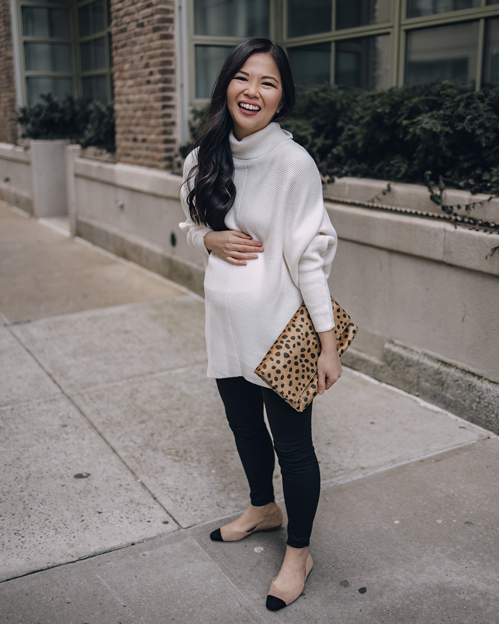 White mockneck tunic sweater (XS) / Leopard clutch / Black maternity leggings (one size – here are my favorite non-maternity leggings) / Black and beige cap toe flats (6.5 TTS – c/o Ann Taylor) / Charlotte Tilbury Lipstick in ‘Pillow Talk’