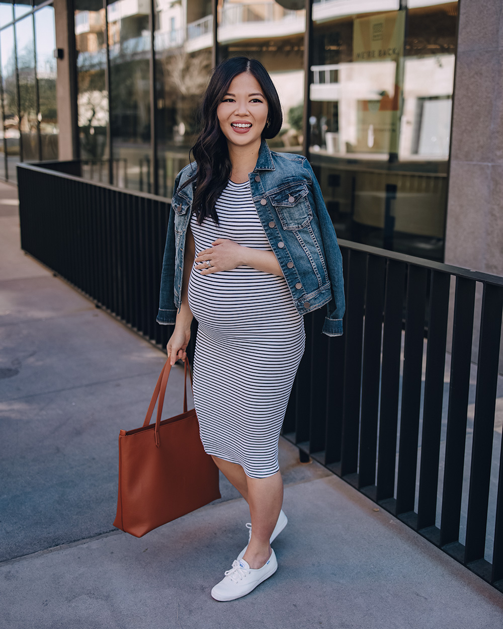 Dark wash denim jacket (XS) / Black and white striped maternity dress (XS) / Brown faux leather tote bag with zipper / White leather sneakers (6.5 TTS) / Charlotte Tilbury lipstick in ‘Pillow Talk’