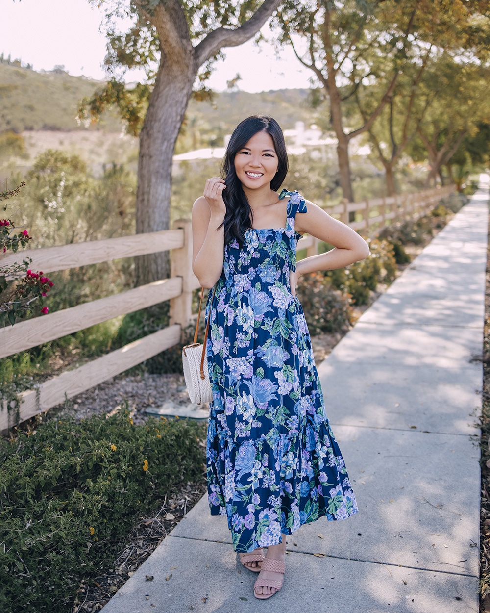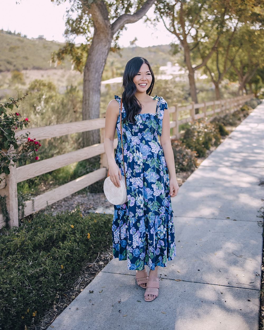 This blue midi dress pretty much has it all: smocked top, tie straps and a stunning floral print that will have you blooming all spring and summer. Honestly, I’m not sure if I’ve ever loved a dress more than this one – J.Crew really brought their A-game with their spring dresses, but this one takes the cake! I sized up to a S (normally an XS) to accommodate the bump, but I love that the top is smocked and stretchy and that the straps are adjustable. This will definitely be a maternity friendly dress that I can wear now with the bump and later with the baby!